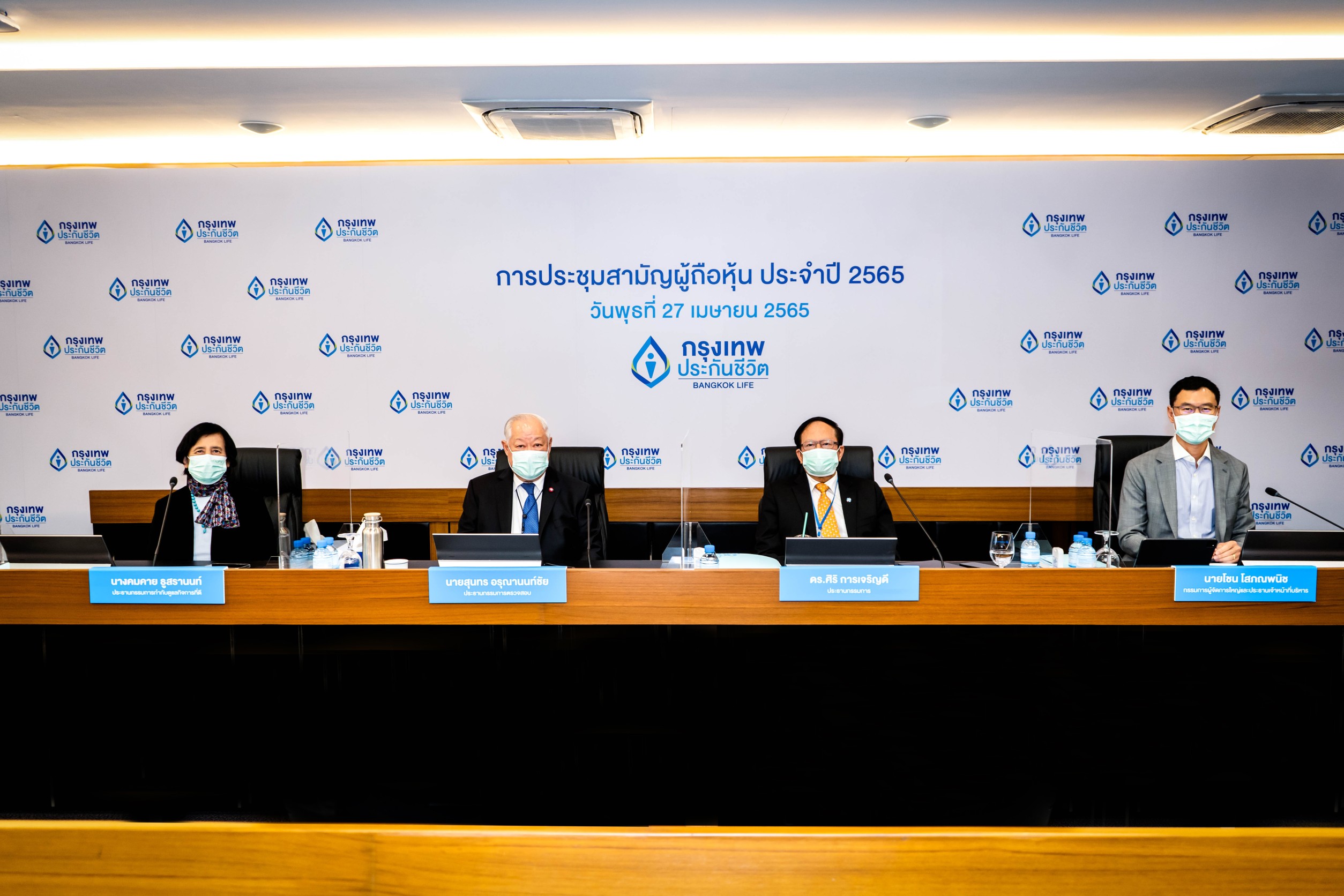 29 เมษายน 2565 : บริษัท กรุงเทพประกันชีวิต จำกัด (มหาชน) หรือ Bangkok Life Assurance จัดประชุมสามัญผู้ถือหุ้น ประจำปี 2565 ในรูปแบบการประชุมผ่านสื่ออิเล็กทรอนิกส์ หรือ E-AGM เมื่อวันพุธที่ 27 เมษายน 2565 โดยมี ดร. ศิริ การเจริญดี (ที่ 2 จากขวา) ประธานกรรมการ และกรรมการอิสระ เป็นประธานในการประชุม พร้อมด้วย โชน โสภณพนิช (ขวาสุด) กรรมการผู้จัดการใหญ่และประธานเจ้าหน้าที่บริหาร, สุนทร อรุณานนท์ชัย (ที่ 2 จากซ้าย) ประธานกรรมการตรวจสอบ และกรรมการอิสระ และ คมคาย ธูสรานนท์ (ซ้ายสุด) ประธานกรรมการกำกับดูแลกิจการที่ดี และกรรมการอิสระ เข้าร่วมการประชุมอย่างพร้อมเพรียงกัน นอกจากนี้ในที่ประชุมฯ ยังมีมติอนุมัติจ่ายเงินปันผลสำหรับผลการดำเนินงานปี 2564 ในอัตราหุ้นละ 0.56 บาท โดยกำหนดจ่ายเงินปันผลในวันพุธที่ 25 พฤษภาคม 2565