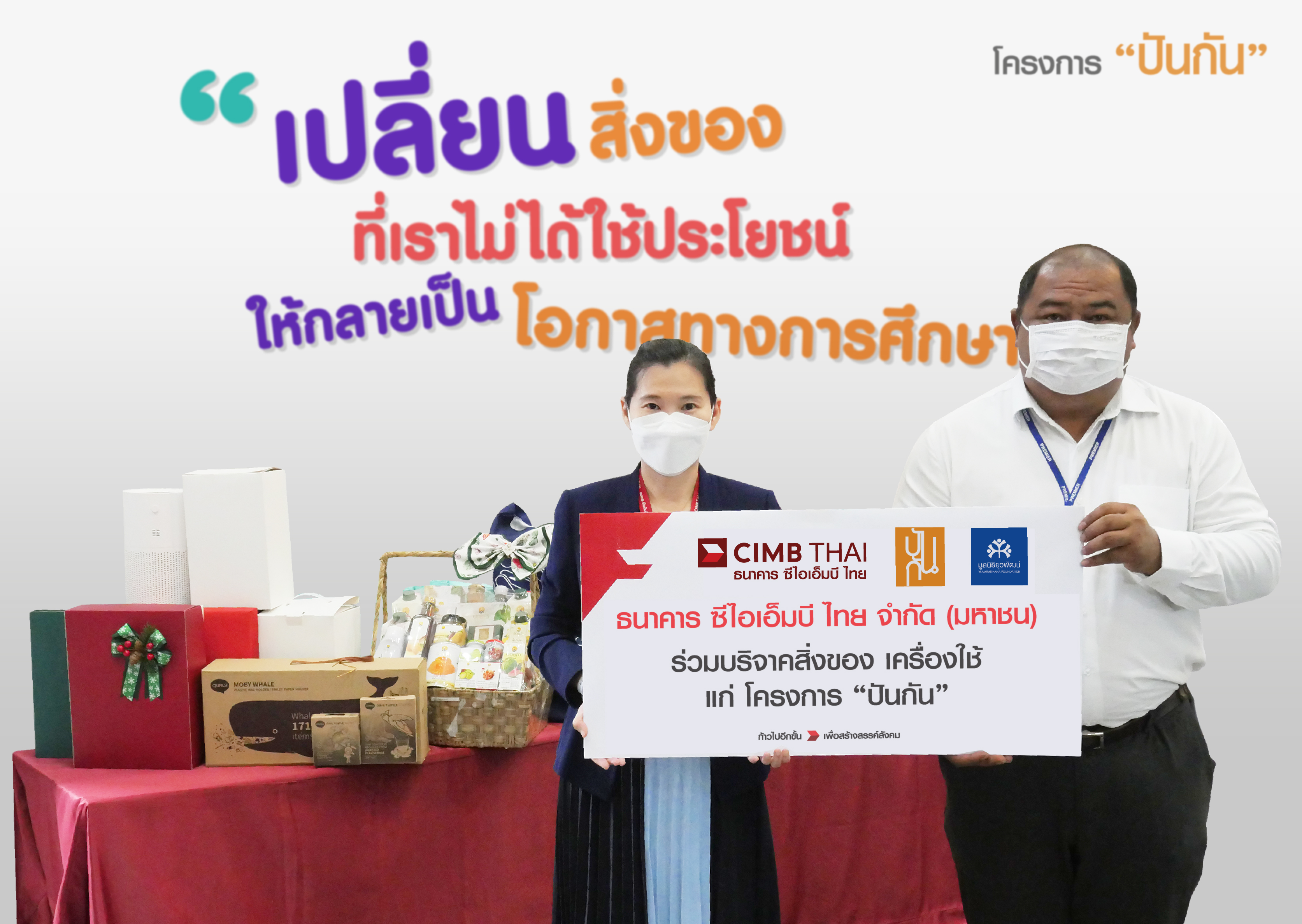 2 พฤษภาคม 2565 : ธนาคาร ซีไอเอ็มบี ไทย ส่งมอบของขวัญที่ทุกฝ่ายงานภายในธนาคารได้รับช่วงเทศกาลปีใหม่ มอบให้ “โครงการปันกัน เปลี่ยนสิ่งของที่เราไม่ได้ใช้ ให้กลายเป็นโอกาสทางการศึกษา” เพื่อเปลี่ยนเป็นทุนการศึกษาให้เด็กๆที่ขาดโอกาสในความดูแลของมูลนิธิยุวพัฒน์ที่มีมากกว่า 9,400 คนทั่วประเทศ โดยมีน.ส.สุนิษฐา ยอดชีวัน ผู้บริหารประชาสัมพันธ์และกิจกรรมเพื่อสังคม ธนาคาร ซีไอเอ็มบี ไทย เป็นตัวแทนธนาคารส่งมอบ ให้แก่นายปรเมศร์ เศษรินทร์ ผู้จัดการฝ่ายคลังสินค้าและโลจิสติกส์ ร้านปันกันโดยมูลนิธิยุวพัฒน์