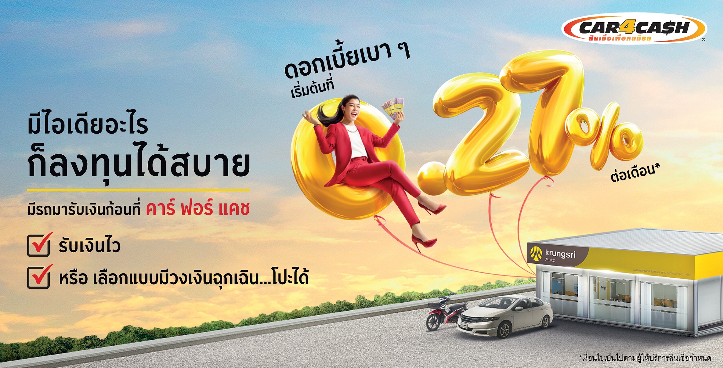 9 พฤษภาคม 2565 : นายพรเทพ ถิรสุนทรากุล ผู้บริหารสายงานการตลาด ธุรกิจสินเชื่อยานยนต์ ธนาคารกรุงศรีอยุธยา จำกัด (มหาชน) กล่าวว่า “ตลาดสินเชื่อเพื่อคนมีรถยังคงมีแนวโน้มเติบโตต่อเนื่องจากหลายปัจจัย ทั้งความต้องการสินเชื่อที่ยังอยู่ในระดับสูง และนวัตกรรมผลิตภัณฑ์ใหม่ๆ จากผู้ให้บริการสินเชื่อ สำหรับ คาร์ ฟอร์ แคช ซึ่งเป็นแบรนด์ผู้บุกเบิกตลาดรีไฟแนนซ์รถในประเทศไทย เราให้ความสำคัญกับการพัฒนาผลิตภัณฑ์และบริการที่เข้าถึงความต้องการด้านการเงินของคนมีรถในทุกกลุ่ม ขณะเดียวกัน เรายังมุ่งมอบประสบการณ์ที่ดีในทุกจุดของ Customer Journey ซึ่งทำให้ คาร์ ฟอร์ แคช ยังคงครองตำแหน่งผู้นำตลาดมาตลอด 19 ปี ด้วยฐานลูกค้าปัจจุบัน 312,000 ราย และพอร์ตสินเชื่อมูลค่ารวม 80,220 ล้านบาท”