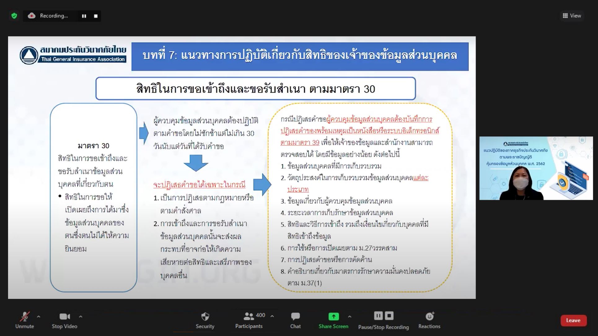 จากประเด็นคำถามและข้อหารือต่าง ๆ ที่บริษัทสมาชิกได้ส่งมาสอบถามก่อนการจัดสัมมนา รวมทั้งยังได้เปิดโอกาสให้ผู้แทนจากบริษัทสมาชิกได้มีโอกาสสอบถามแนวทางปฏิบัติเกี่ยวกับกฎหมายคุ้มครองข้อมูลส่วนบุคคลอย่างใกล้ชิด ทั้งนี้ การจัดสัมมนาดังกล่าวจะช่วยเสริมสร้างความเข้าใจให้กับบริษัทสมาชิกให้มีความพร้อมในการปฏิบัติตามกฎหมาย ซึ่งจะเริ่มมีผลบังคับใช้ในวันที่ 1 มิถุนายน 2565 โดยงานสัมมนานี้มีผู้แทนจากบริษัทสมาชิกฯ ผู้แทนจากคณะกรรมการประกันภัยและชมรมต่าง ๆ ของสมาคมฯ เข้าร่วมสัมมนาผ่านทางระบบออนไลน์ (Zoom Meeting) รวมทั้งสิ้นกว่า 400 คน