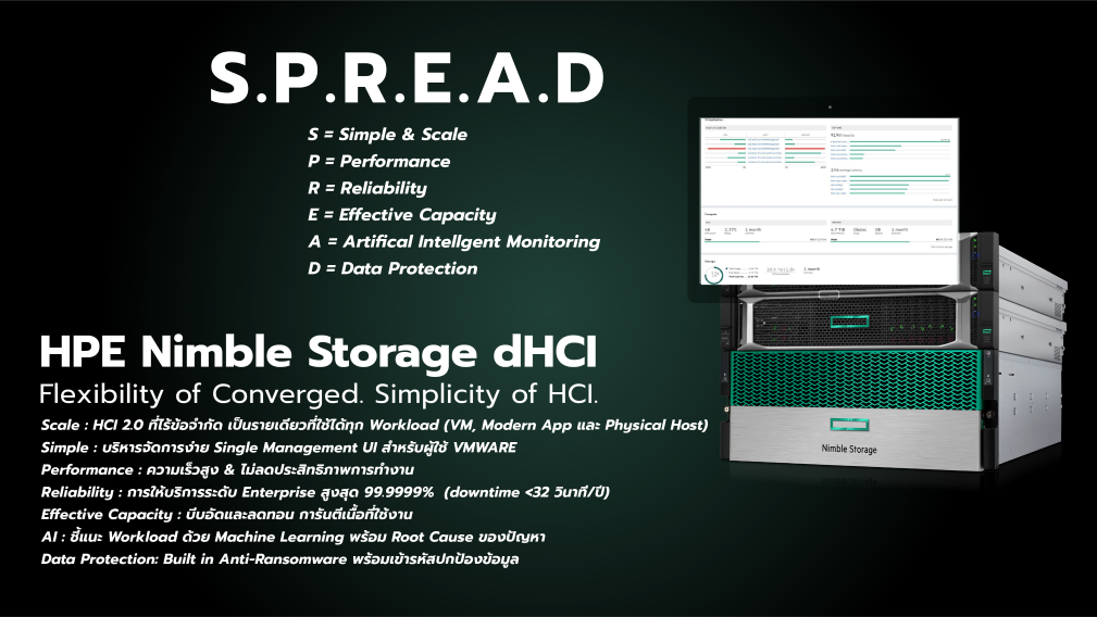 3. เติมเต็มประสิทธิภาพด้วย AI (AI-Driven) มาช่วยบริหารจัดการอินฟราสตรัคเจอร์ที่มีความซับซ้อนให้มีความมั่นคงปลอดภัย เพิ่มการตัดสินใจที่ถูกต้องและแม่นยำ ตลอดจนชูความสามารถของเทคโนโลยี (S.P.R.E.A.D) ซึ่งออกแบบมาให้โดดเด่นและเข้ากันได้กับทุกภาระงาน (Workload)