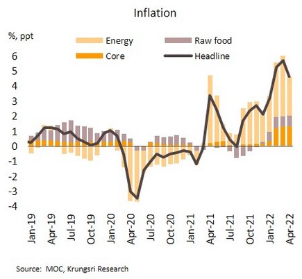 อัตราเงินเฟ้อในเดือนพฤษภาคมมีแนวโน้มจะกลับมาเร่งขึ้นตามการปรับขึ้นของราคาสินค้าในหมวดพลังงาน โดยเฉพาะราคาน้ำมันเชื้อเพลิงหลังจากมีการยกเลิกตรึงราคาดีเซลไว้ที่ 30 บาทต่อลิตร และให้เริ่มทยอยปรับราคาขึ้นแบบขั้นบันไดตั้งแต่ 32 บาทต่อลิตร จนอาจถึงกรอบเพดานใหม่ที่ 35 บาทต่อลิตร จึงอาจกระทบต่อต้นทุนการขนส่งและการผลิตสินค้า รวมถึงยังมีการปรับขึ้นราคาก๊าซหุงต้ม และการปรับขึ้นค่าไฟฟ้าผันแปร (Ft) รอบเดือนพฤษภาคม-สิงหาคม รวมถึงราคาสินค้าอุปโภคบริโภคที่ยังมีแนวโน้มปรับสูงขึ้นตามต้นทุนการผลิตและวัตถุดิบ