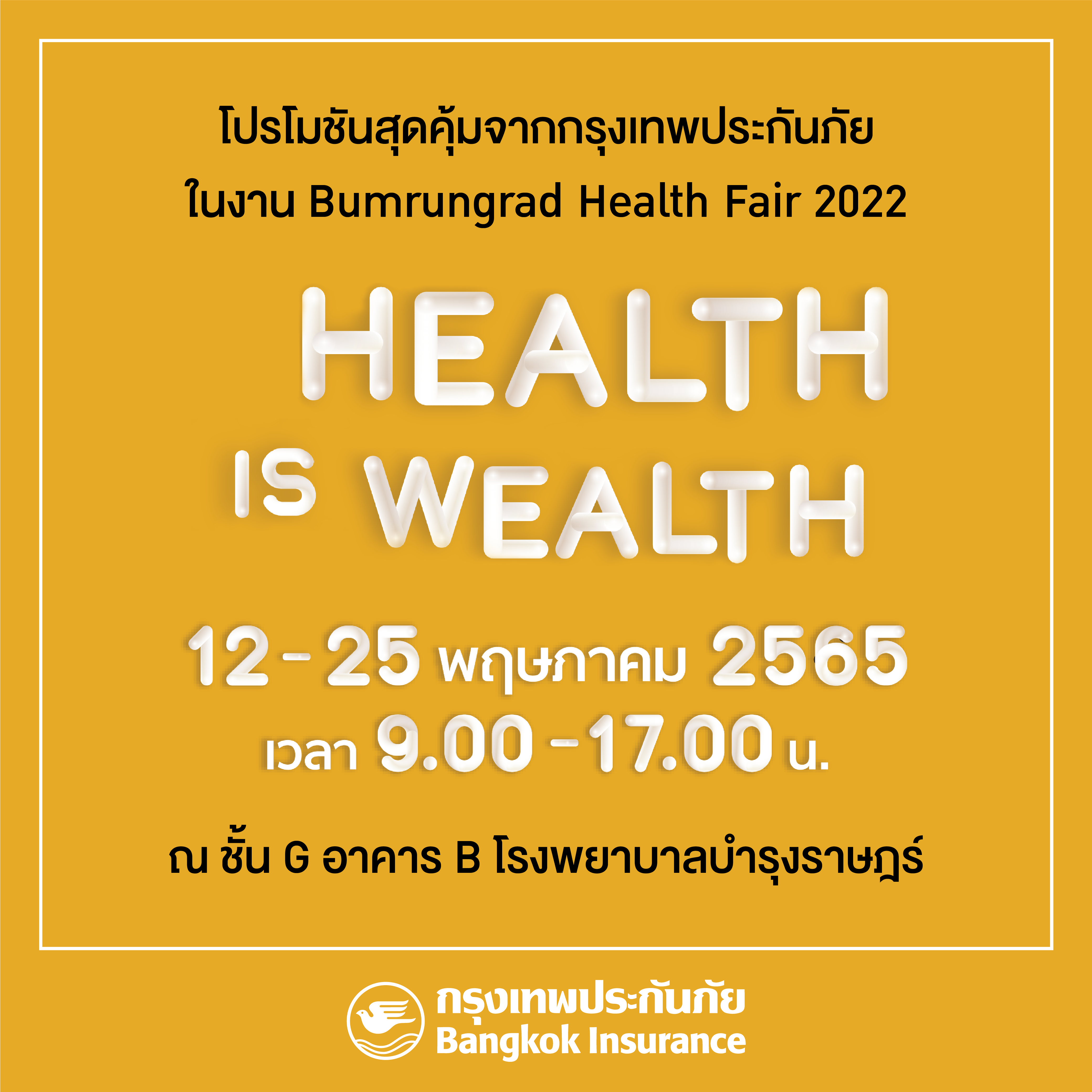 • อีกหนึ่งงานดีๆ สำหรับคนรักสุขภาพ ในงาน Bamrungrad Health Fair 2022 ซึ่งจัดขึ้นตั้งแต่วันที่ 12-25 พฤษภาคม 2565 ชั้น G อาคาร B โรงพยาบาลบำรุงราษฎร์ โดยทีมงานพร้อมให้คำปรึกษาและคำแนะนำเกี่ยวกับผลิตภัณฑ์ประกันภัยสุขภาพที่หมาะกับคุณและคนที่คุณรัก ทั้งประกันภัยโรคมะเร็ง ประกันภัยสุขภาพ ประกันภัยสุขภาพแผนผู้ป่วยใน Health IPD Plan ประกันภัยสุขภาพ Health IPD+OPD เป็นต้น ![]()