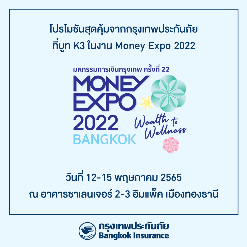 • งานมหกรรมการเงินที่ยิ่งใหญ่ที่สุดในไทย Money Expo 2022 ในวันที่ 12-15พฤษภาคม 2565 ณ บูท K3 อาคารชาเลนเจอร์ 2-3 อิมแพ็ค เมืองทองธานี ภายใต้คอนเซปต์ Wealth to Wellness ความสมดุลแห่งชีวิต ความมั่งคั่งทางการเงินและสุขภาพ
