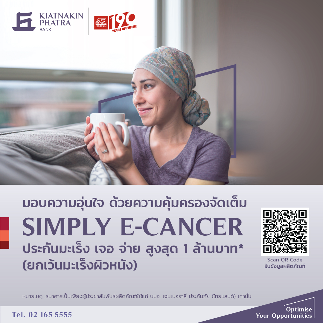สำหรับประกันมะเร็ง Simply E-Cancer ให้ความคุ้มครองสูงสุดหลักล้าน โดยมี 3 แผนให้เลือกตามความต้องการของลูกค้า ค่าเบี้ยประกันเริ่มต้นเฉลี่ยวันละ 4 บาท (สำหรับผู้สมัครแผนเริ่มต้นที่มีอายุ 16-25 ปี) เลือกชำระได้ทั้งแบบรายเดือนและรายปี จุดเด่นของผลิตภัณฑ์นี้คือเป็นประกันมะเร็งที่ให้ผลประโยชน์เป็นเงินก้อนเมื่อตรวจพบโรคมะเร็งครั้งแรก ทุกชนิดทุกระยะ (ยกเว้นมะเร็งผิวหนัง) และคุ้มครองเป็น 2 เท่า กรณีที่ตรวจพบมะเร็งฮิตในเพศชายตามที่ระบุไว้ เช่น มะเร็งต่อมลูกหมาก มะเร็งปอด มะเร็งตับ มะเร็งลำไส้ใหญ่ มะเร็งหลอดอาหาร เป็นต้น