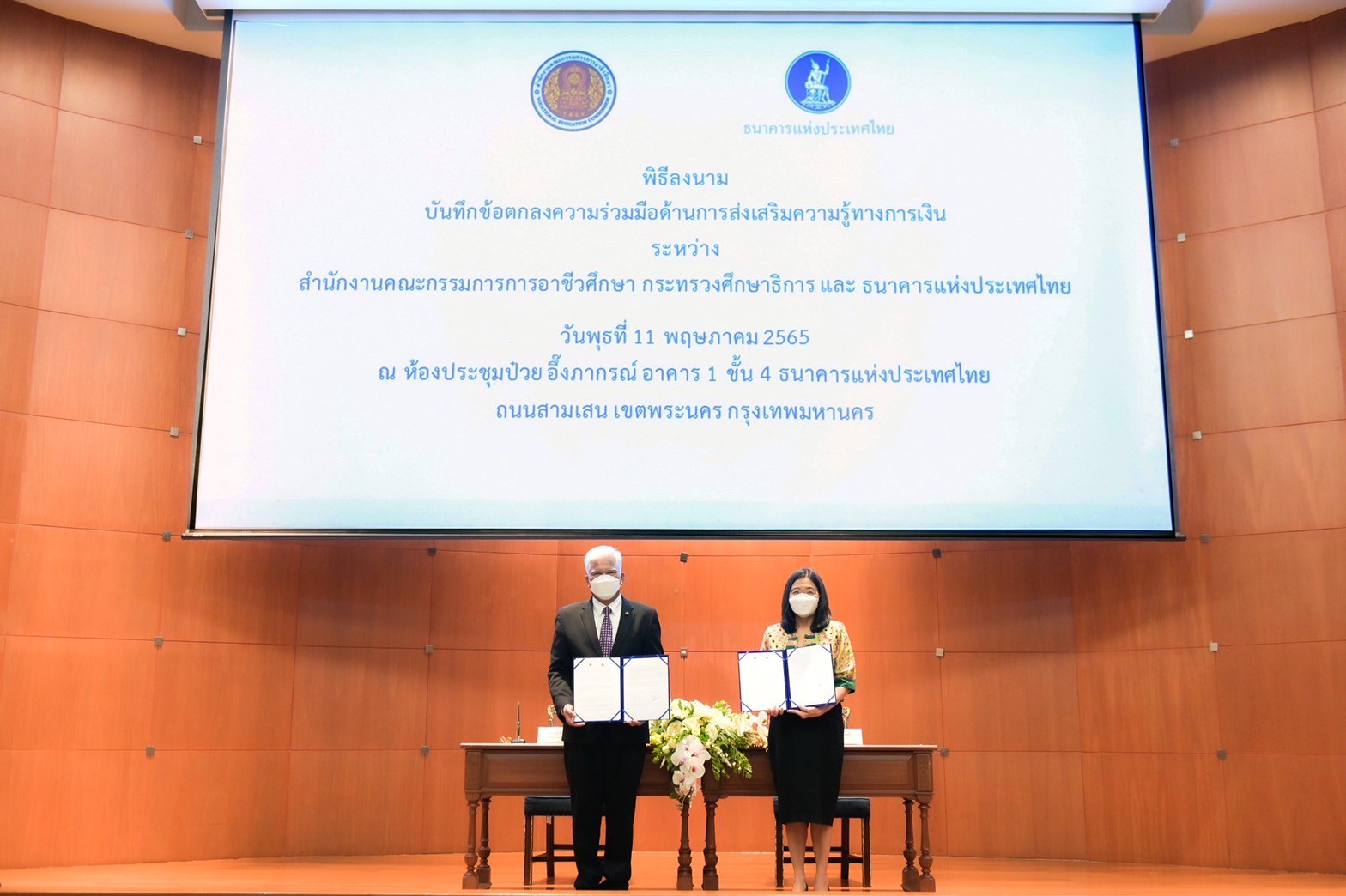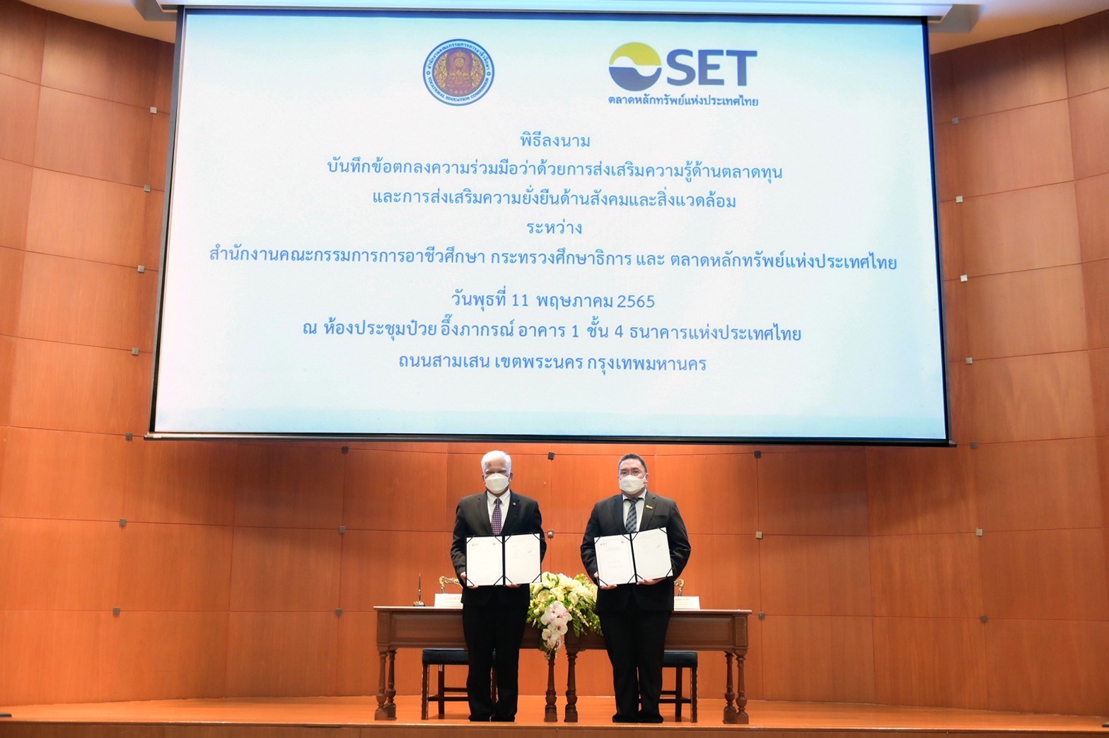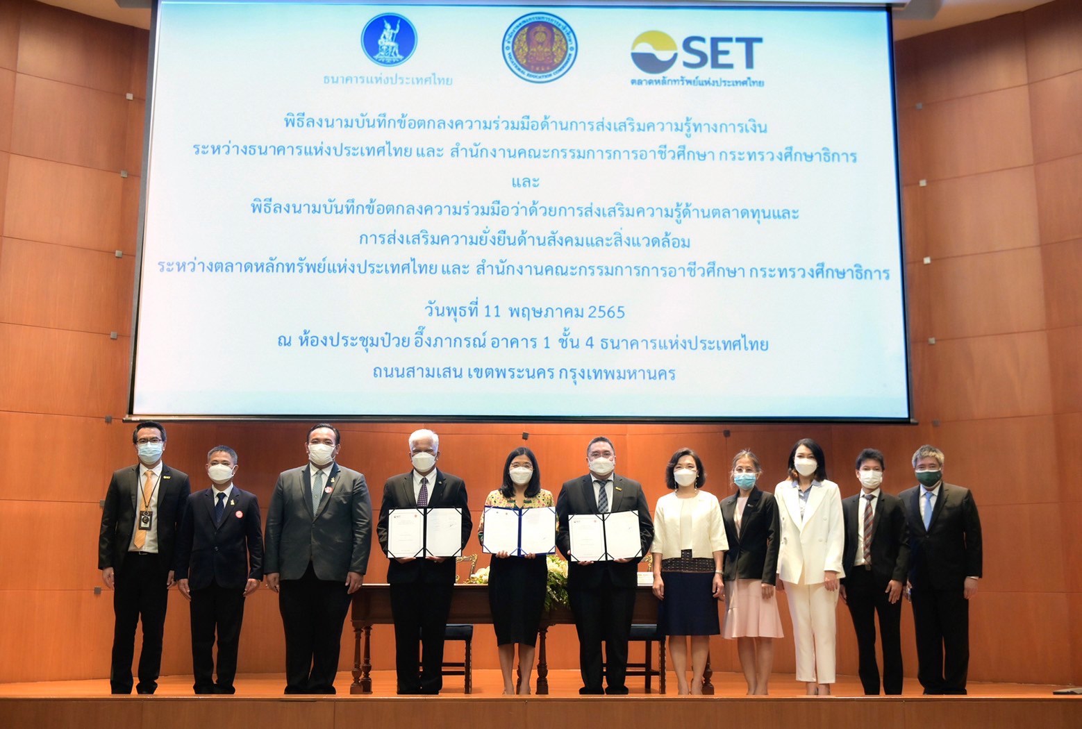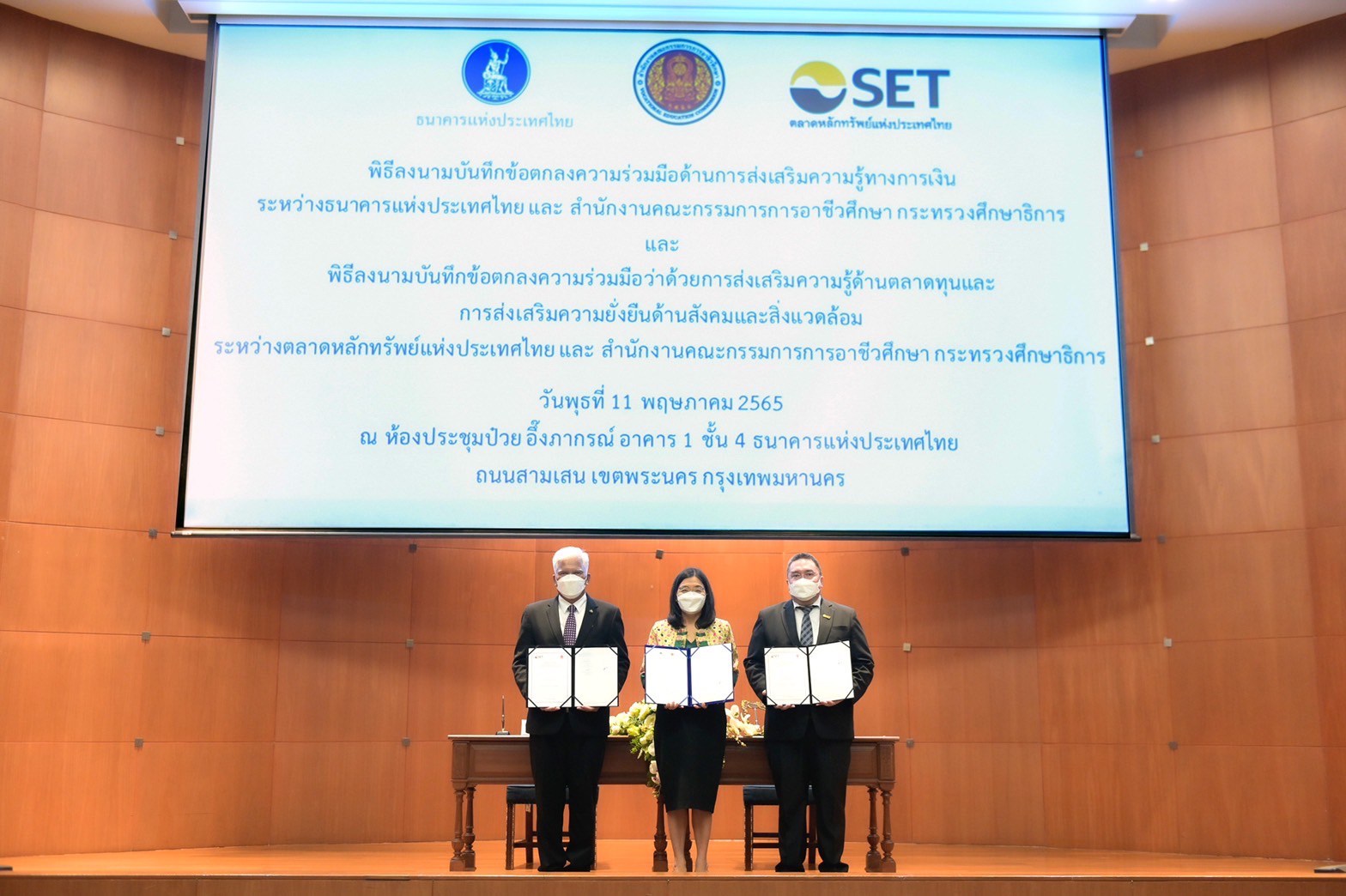 12 พฤษภาคม 2565 : สุเทพ แก่งสันเทียะ เลขาธิการคณะกรรมการอาชีวศึกษา สำนักงานคณะกรรมการการอาชีวศึกษา กระทรวงศึกษาธิการ และ วชิรา อารมย์ดี รองผู้ว่าการ ด้านบริหาร ธนาคารแห่งประเทศไทย ได้ลงนามในบันทึกข้อตกลงความร่วมมือด้านการส่งเสริมความรู้ทางการเงิน และ สุเทพ แก่งสันเทียะ พร้อมด้วยนายศรพล ตุลยะเสถียร รองผู้จัดการ หัวหน้าสายงานวางแผนกลยุทธ์องค์กรและหัวหน้าสายงานพัฒนาความยั่งยืนตลาดทุน ตลาดหลักทรัพย์แห่งประเทศไทย ลงนามในบันทึกข้อตกลงความร่วมมือว่าด้วยการส่งเสริมความรู้ด้านตลาดทุนและการส่งเสริมความยั่งยืนด้านสังคมและสิ่งแวดล้อม เมื่อวันที่ 11 พฤษภาคม 2565 ณ ห้องประชุมป๋วย อึ๊งภากรณ์ อาคาร 1 ชั้น 4 ธนาคารแห่งประเทศไทย สำนักงานใหญ่