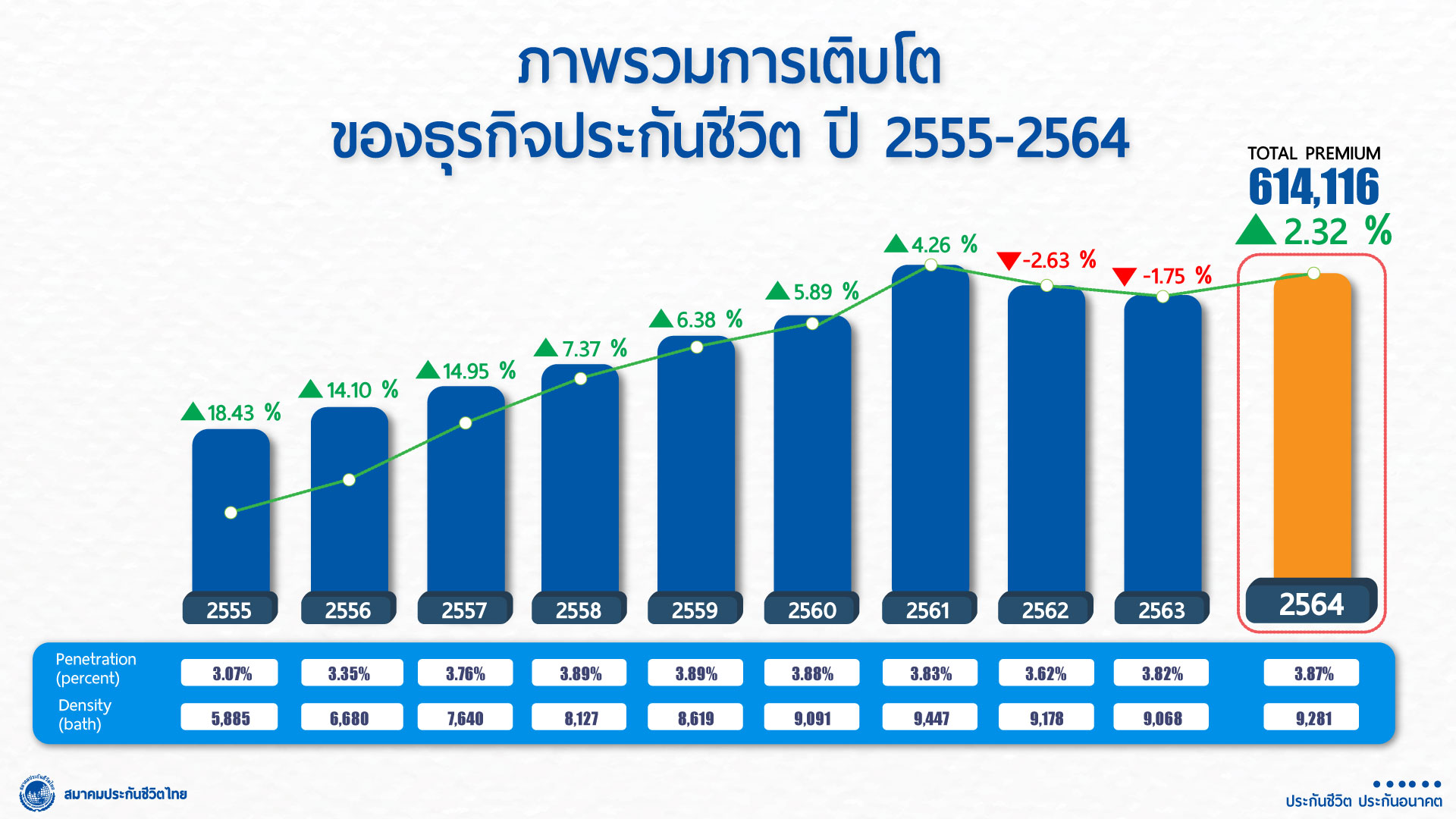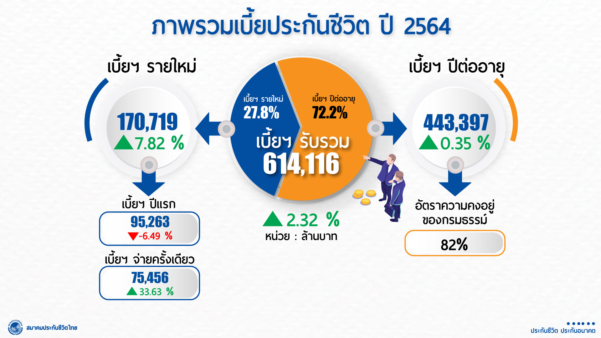 12 พฤษภาคม 2565 : นายสาระ ล่ำซำ นายกสมาคมประกันชีวิตไทย เปิดเผยถึงภาพรวมธุรกิจประกันชีวิตของปี 2564 ระหว่างมกราคม – ธันวาคม มีเบี้ยประกันภัยรับรวมอยู่ที่ 614,115.5 ล้านบาท เติบโตเพิ่มขึ้นร้อยละ 2.3 เมื่อเทียบกับปี 2563 จำแนกเป็น เบี้ยประกันภัยรับรายใหม่ 170,718.6 ล้านบาท อัตราการเติบโตเพิ่มขึ้นร้อยละ 7.8 และเบี้ยประกันภัยรับปีต่อไป 443,396.9 ล้านบาท มีอัตราการเติบโตเพิ่มขึ้นร้อยละ 0.4 โดยมีอัตราความคงอยู่ของกรมธรรม์ร้อยละ 82