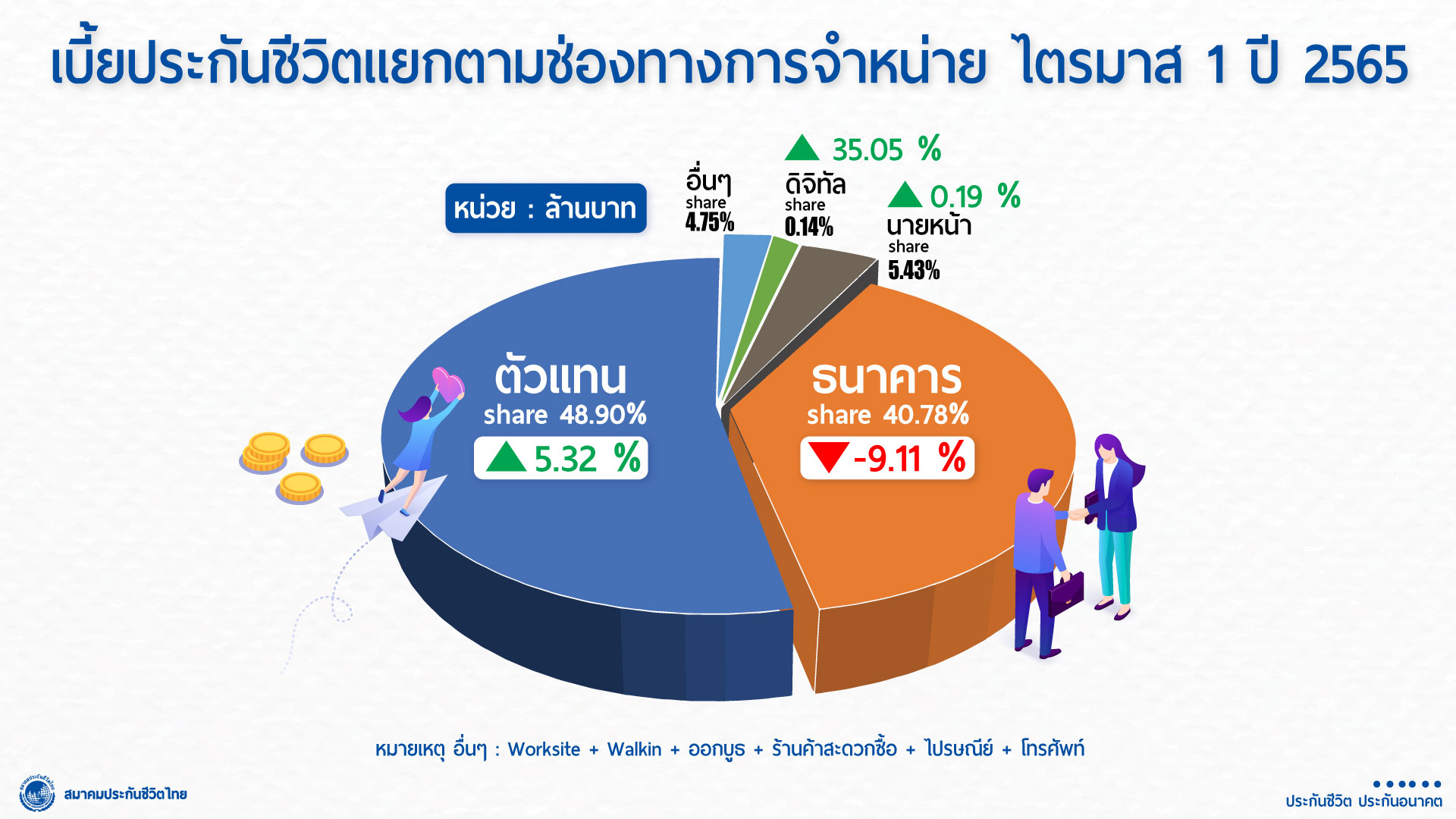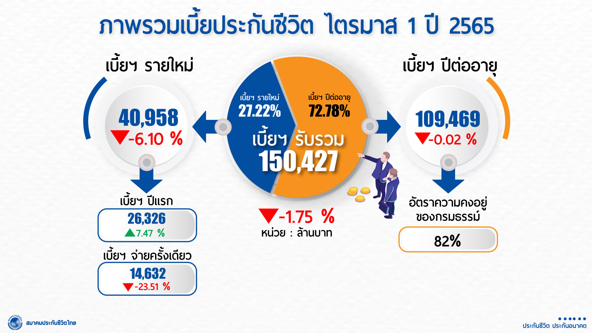 สำหรับภาพรวมธุรกิจประกันชีวิตในไตรมาสแรก ปี 2565 ระหว่าง มกราคม – มีนาคม มีเบี้ยประกันภัยรับรวมอยู่ที่ 150,427.3 ล้านบาท เติบโตลดลงร้อยละ 1.8 เมื่อเทียบกับไตรมาสแรก ปี 2564 จำแนกเป็น เบี้ยประกันภัยรับรายใหม่ 40,958.0 ล้านบาท อัตราการเติบโตลดลงร้อยละ 6.1 และเบี้ยประกันภัยรับปีต่อไป 109,469.3 ล้านบาท อัตราการเติบโตลดลงร้อยละ 0.02 โดยมีอัตราความคงอยู่ของกรมธรรม์ร้อยละ 82