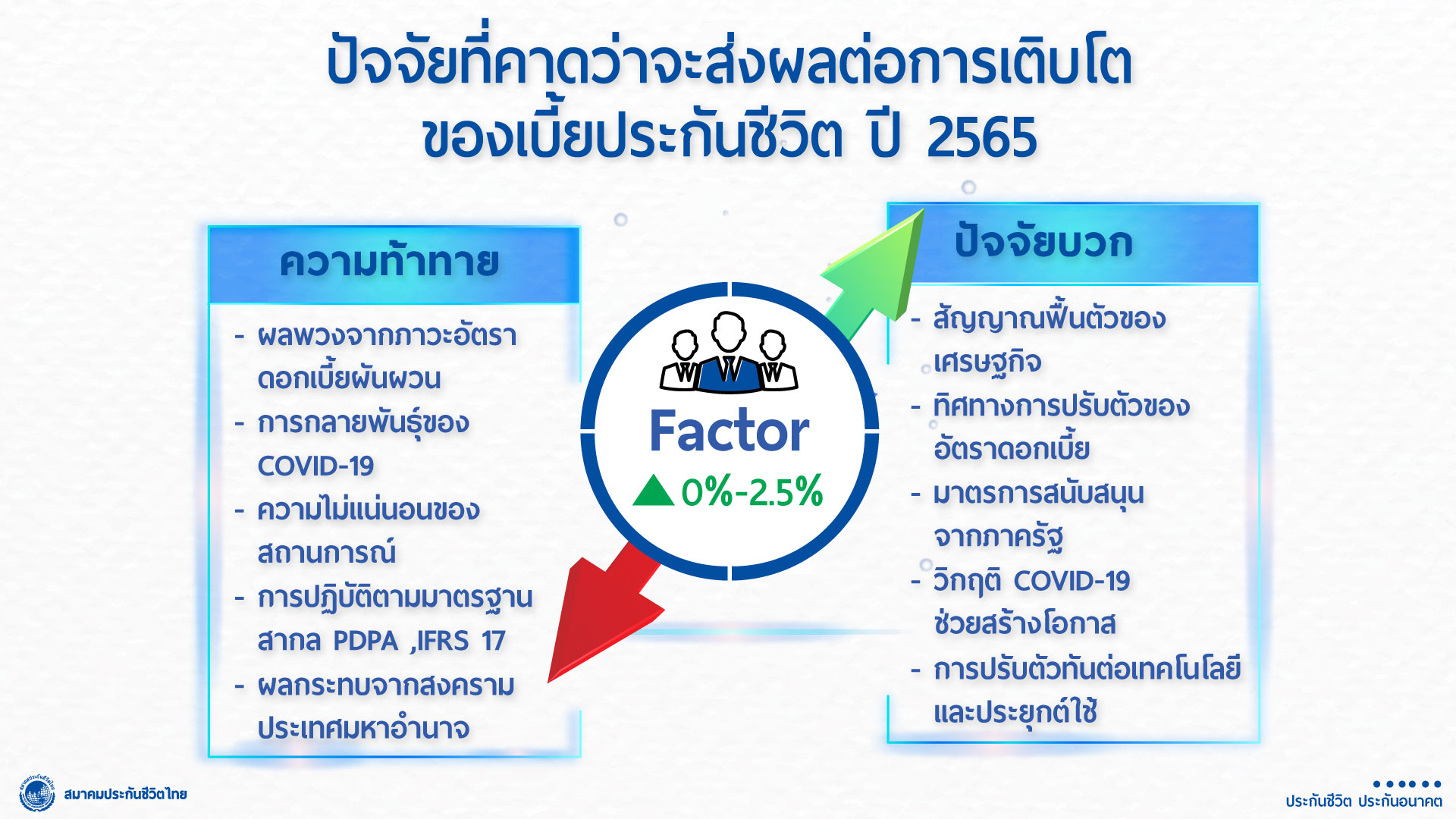ขณะที่ประเทศไทยเริ่มมีสัญญาณการฟื้นตัวทางด้านเศรษฐกิจ ซึ่งจากข้อมูลของสำนักงานสภาพัฒนาการเศรษฐกิจและสังคมแห่งชาติที่คาดการณ์อัตราการขยายตัวทางเศรษฐกิจไทย (GDP) ในปี 2565 ขยายตัวร้อยละ 3.5 – 4.5 นอกจากนี้ภาครัฐมีนโยบายส่งเสริมภาคธุรกิจประกันภัย โดยเฉพาะอย่างยิ่งการลดหย่อนภาษีของประกันชีวิตและประกันสุขภาพ รวมถึงประกันบำนาญ ที่เป็นเครื่องมือช่วยบริหารความเสี่ยงทางด้านการเงินซึ่งเป็นทั้งการออมและมีความคุ้มครองทั้งชีวิตและสุขภาพ ในขณะที่สำนักงานคณะกรรมการกำกับและส่งเสริมการประกอบธุรกิจประกันภัย (คปภ.) ได้ส่งเสริมให้ภาคธุรกิจมีการนำเทคโนโลยีหรือนวัตกรรมใหม่ ๆ (Innovation) เพื่อพัฒนากระบวนการเสนอขายและบริการ รวมถึงพัฒนากระบวนการขายให้สอดคล้องกับพฤติกรรมและความต้องการของลูกค้าที่เปลี่ยนแปลงมากขึ้น