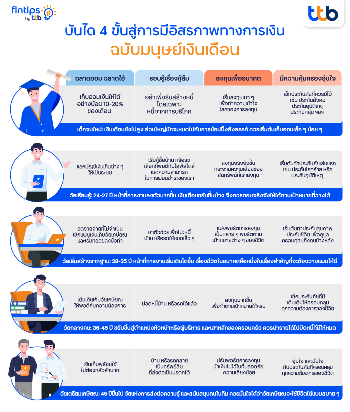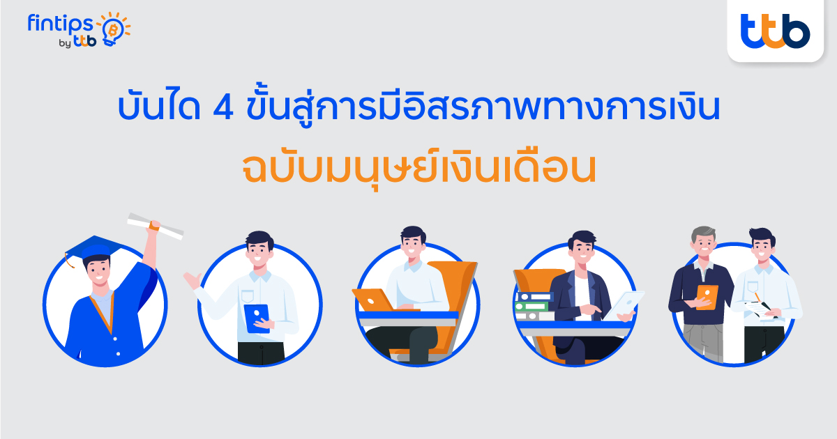 18 พฤษภาคม 2565 : ‘อิสรภาพทางการเงิน’ เป็นวิชาสำคัญสำหรับมนุษย์เงินเดือนที่ควรทำความเข้าใจ และเริ่มต้นวางแผนตั้งแต่วันแรกที่เริ่มทำงาน ถ้าอยากใช้ชีวิตอย่างเต็มที่ มีอิสระอย่างใจฝัน หมดกังวลกับเรื่องเงินในอนาคต fintips by ttb ขอแนะนำแนวคิด “บันได 4 ขั้นสู่การมีอิสรภาพทางการเงิน” ฉบับมนุษย์เงินเดือน ให้พร้อมลงมือวางแผนเพื่อเดินไปสู่เป้าหมายได้สำเร็จ ดังนี้