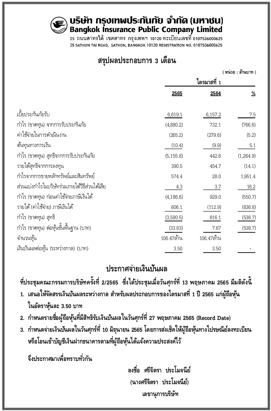 โดยที่ประชุมคณะกรรมการบริษัทฯ ซึ่งได้ประชุมเมื่อวันที่ 13 พฤษภาคม 2565 มีมติให้จ่ายเงินปันผลระหว่างกาลสำหรับผลประกอบการไตรมาสที่ 1 ปี 2565 แก่ผู้ถือหุ้นในอัตราหุ้นละ 3.50 บาท ซึ่งเท่ากับไตรมาสที่ 1 ปี 2564 เนื่องจากบริษัทฯ มีกำไรสะสมเพียงพอต่อการจ่ายเงินปันผล บริษัทฯ ขอยืนยันในความมั่นคงแข็งแกร่งของฐานะการเงินที่มีการบริหารจัดการความเสี่ยงเป็นอย่างดี กรุงเทพประกันภัยยังคงมุ่งมั่นที่จะตอบสนองความคาดหวังและสร้างประโยชน์สูงสุดต่อลูกค้า คู่ค้า ผู้ถือหุ้น และผู้มีส่วนได้เสียของบริษัทฯ ทุกกลุ่มตามหลักปรัชญาในการดำเนินธุรกิจที่ยืดถือมาตลอดระยะเวลา 75 ปี