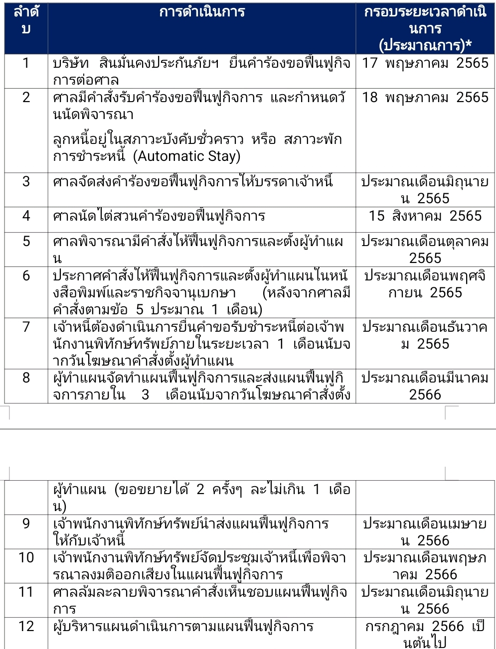 ประมาณการกรอบระยะเวลาดำเนินการการฟื้นฟูกิจการในเบื้องต้น