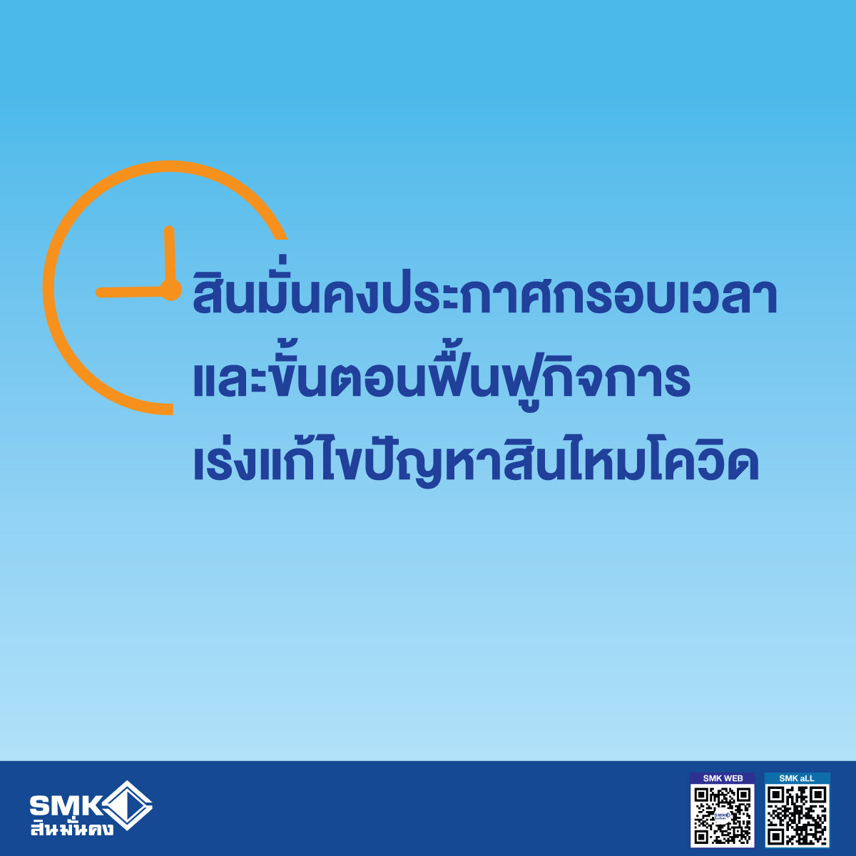 23 พฤษภาคม 2565 : ตามที่บริษัท สินมั่นคงประกันภัย จำกัด (มหาชน) ได้ยื่นคำร้องขอฟื้นฟูกิจการต่อศาลล้มละลายกลางเมื่อวันที่ 17 พฤษภาคม 2565 และในวันที่ 18 พฤษภาคม 2565 ศาลฯ ได้มีคำสั่งรับคำร้องขอฟื้นฟูกิจการของบริษัทฯ แล้ว บริษัทฯ จึงได้กำหนดกรอบระยะเวลาประมาณการเพื่อฟื้นฟูกิจการในเบื้องต้น และขั้นตอนกระบวนการฟื้นฟูกิจการตามกฎหมาย เพื่อเร่งแก้ไขปัญหาสินไหมโควิด และสร้างความมั่นใจในการดำเนินธุรกิจของบริษัทฯ ต่อไป โดยมีรายละเอียดดังนี้