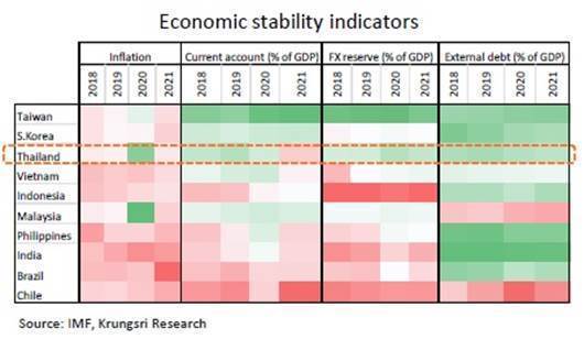 วิจัยกรุงศรีคงคาดการณ์ว่ากนง. จะไม่รีบปรับขึ้นดอกเบี้ยนโยบายในปีนี้ เนื่องจาก (i) แม้อัตราเงินเฟ้อในปีนี้จะอยู่เหนือกรอบเป้าหมาย แต่การเพิ่มขึ้นของอัตราเงินเฟ้อไม่ได้กระจายเป็นวงกว้าง โดยมีสัญญาณเล็กน้อยของแรงกดดันด้านราคาที่เพิ่มขึ้นในภาคบริการ เนื่องจากอุปสงค์ยังคงอ่อนแอท่ามกลางตลาดแรงงานที่ซบเซา (ii) ไทยรองรับความเสี่ยงต่อผลกระทบจากภายนอกได้ดีกว่าบางประเทศ สะท้อนจากเสถียรภาพด้านต่างประเทศของไทยอยู่ในอันดับที่เข้มแข็งรองจากไต้หวันและเกาหลี ซึ่งช่วยลดความกังวลเงินทุนไหลออก และ (iii) การฟื้นตัวของเศรษฐกิจไทยยังเติบโตช้าและกิจกรรมทางเศรษฐกิจในปีนี้จะยังอยู่ในระดับต่ำกว่าก่อนเกิดการระบาด