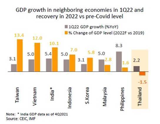 โดย GDP ไตรมาสแรกของไทยเติบโตเพียง 2.2% YoY ซึ่งอ่อนแอกว่าเศรษฐกิจส่วนใหญ่ในภูมิภาค นอกจากนี้ จากข้อมูลคาดการณ์ของ IMF พบว่าระดับกิจกรรมทางเศรษฐกิจของไทยตลอดทั้งปี 2565 จะยังคงต่ำกว่าระดับก่อนเกิดการระบาด 1.5% ในขณะที่ประเทศอื่นๆ กิจกรรมทางเศรษฐกิจจะกลับมาสูงกว่าช่วงก่อนเกิดการระบาดแล้วราว 1.6-13.4% ดังนั้น แม้จะมีแรงกดดันต่อการปรับขึ้นดอกเบี้ยนโยบาย แต่การฟื้นตัวของเศรษฐกิจไทยที่ยังอ่อนแอเมื่อเทียบกับเพื่อนบ้าน จึงอาจมีผลต่อการปรับนโยบายของกนง. นอกจากนี้ สำหรับไทยการขึ้นอัตราดอกเบี้ยในปีนี้ไม่น่าจะช่วยบรรเทาเงินเฟ้อด้านอุปทาน และอาจส่งผลกระทบต่อการฟื้นตัวของเศรษฐกิจที่ยังเปราะบาง ![]()