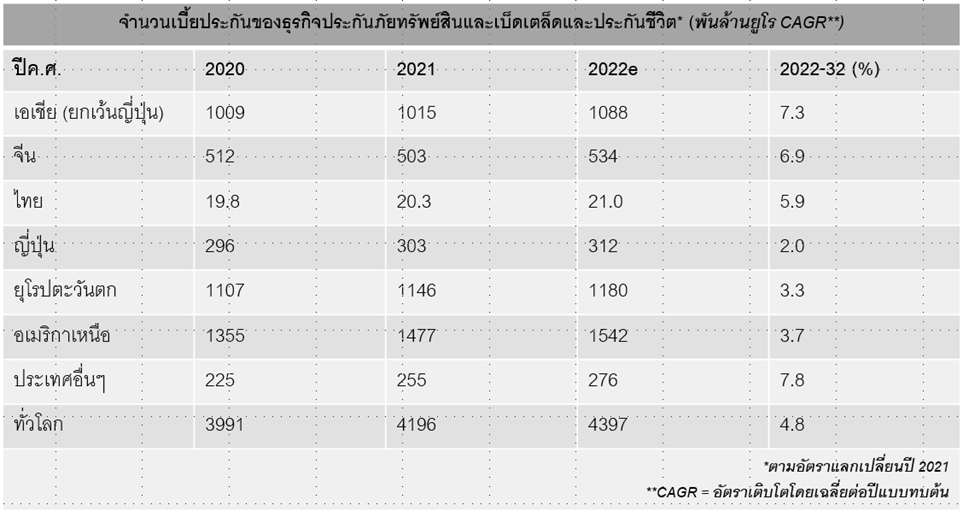 เอเชีย (ไม่รวมญี่ปุ่น) มีอัตราการเติบโตของรายได้เบี้ยประกันรวมเพียงเล็กน้อยหรือ 0.6% จำแนกเป็นรายได้จากเบี้ยประกันชีวิต 0.3% รายได้จากเบี้ยประกันวินาศภัย 1.4% โดยสาเหตุหลักได้แก่ การหดตัวในจีน (-1.7%) รายได้จากเบี้ยประกันรวมยังมากกว่าหนึ่งล้านล้านยูโร แม้จะมีความไม่แน่นอนจากสงครามยูเครนและโควิด 19 มีความเป็นไปได้ที่การเติบโตจะเร่งขึ้นถึง 7.2% ในปี 2022 จำแนกเป็นประกันชีวิต 7.0% ทรัพย์สินและเบ็ดเตล็ด 7.6% และคาดว่าการเติบโตเฉลี่ยในอีก 10 ปีข้างหน้าจะอยู่ที่ 7.3% จำแนกเป็นประกันชีวิต 7.5% ประกันอื่นๆ 6.8% ซึ่งน้อยกว่าทศวรรษที่ผ่านมาที่เติบโตอยู่ที่ 7.5%
