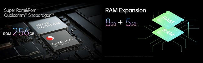 โดยมี RAM Expansion ให้ผู้ใช้สามารถเพิ่ม RAM เสมือนสูงสุดถึง 5GB เพื่อประสบการณ์ที่รวดเร็วและราบรื่นยิ่งขึ้นเมื่อใช้งานหลายแอปพร้อมกัน นอกจากนี้ยังสามารถเต็มอิ่มทุกเอ็นเตอร์เทนเมนท์แบบราบรื่นตลอดวัน โดยเทคโนโลยีการชาร์จ 33W SUPERVOOCTM ผสานรวมกับแบตเตอรี่ขนาดใหญ่ถึง 5,000mAh ทำให้ใช้เวลาชาร์จน้อยลงแต่ใช้งานได้นานขึ้น โดยสามารถชาร์จเต็มได้ในเวลาเพียง 69 นาที อัดแน่นด้วยฟีเจอร์เพื่อเสริมด้านการใช้งานที่ยาวนาน เช่น All-Day AI Power Saving, Night charge protection และ Super Night-time Standby