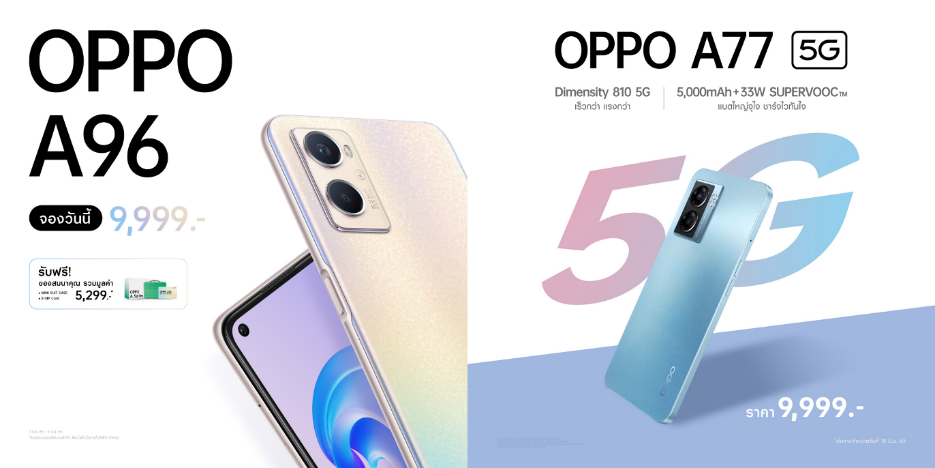 กรุงเทพฯ, 1 มิถุนายน 2565 : ออปโป้ เปิดตัว “OPPO A96” สมาร์ตโฟนรุ่นใหม่ล่าสุดจาก OPPO A Series อย่างเป็นทางการ พร้อมชูสโลแกน “เพิ่มความจุ เติมความจอย” อัดสเปคความจุเยอะ เก็บได้หมดด้วย ROM 256GB ตอบโจทย์ทุกไลฟ์สไตล์ได้อย่างไหลลื่นไม่มีสะดุด พร้อมดีไซน์โดดเด่นแบบ OPPO Glow Design เปิดตัวในราคาเพียง 9,999 บาท พร้อมเปิดตัวร่วมกับ “OPPO A77 5G” อีกทางเลือกสมาร์ตโฟนสุดคุ้มค่ามาพร้อม 5G เปิดตัวในราคา 9,999 บาท เช่นกัน