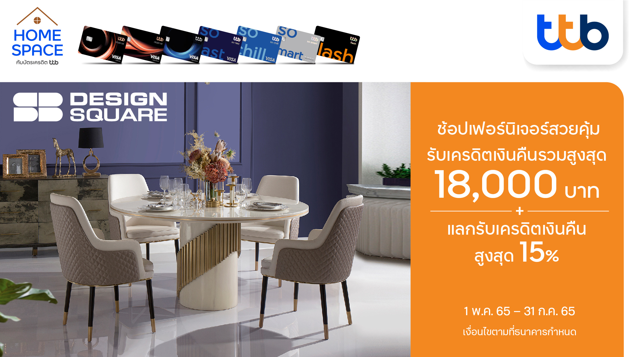 6 มิถุนายน 2565 : บัตรเครดิต ทีทีบี ร่วมกับ SB Design Square เอาใจคนรักบ้าน ชวนช้อปเฟอร์นิเจอร์สวยในราคาสุดคุ้ม เมื่อมียอดใช้จ่ายผ่านบัตรเครดิต ที่ SB Design Square ทุกสาขา ตั้งแต่วันนี้ ถึง 31 กรกฎาคม 2565 โดยรับเครดิตเงินคืนสูงสุด 8,000 บาท / บัญชีบัตรหลัก / ตลอดรายการส่งเสริมการขาย เมื่อมียอดใช้จ่ายแบบชำระเต็มจำนวนตั้งแต่ 25,000 บาทขึ้นไป / เซลล์สลิป หรือรับเครดิตเงินคืนสูงสุด 10,000 บาท / บัญชีบัตรหลัก / ตลอดรายการส่งเสริมการขาย เมื่อเลือกทำรายการแบ่งชำระ 0% นานสูงสุด 10 เดือน (เฉพาะสินค้าที่ร่วมรายการ) โดยมียอดแบ่งชำระตั้งแต่ 30,000 บาทขึ้นไป / เซลล์สลิป