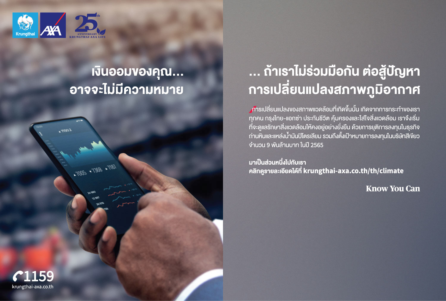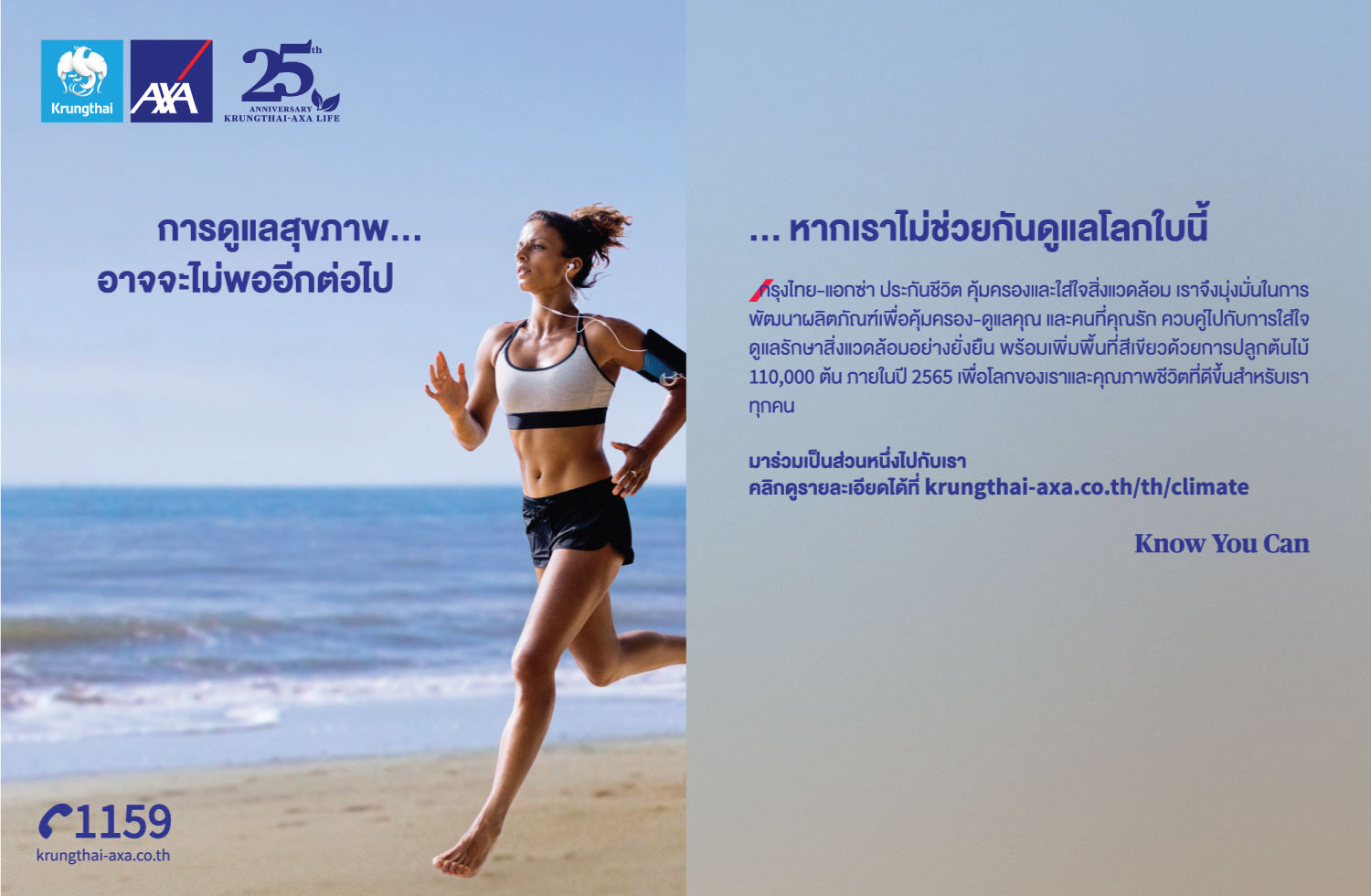 6 มิถุนายน 2565 : บริษัท กรุงไทย-แอกซ่า ประกันชีวิต จำกัด (มหาชน) ในฐานะ ‘Green Insurer’ หรือผู้นำบริษัทประกันที่ใส่ใจสิ่งแวดล้อม โดยคุณบุปผาวดี โอวรารินท์ ประธานเจ้าหน้าที่บริหาร ฝ่ายทรัพยากรบุคคลและภาพลักษณ์องค์กรและการสื่อสารองค์กร เปิดตัวแคมเปญโฆษณาล่าสุด “Climate Change” เพื่อสร้างการตระหนักรู้ในการร่วมต่อสู้ปัญหาการเปลี่ยนแปลงสภาพภูมิอากาศ ลดการใช้พลังงาน และควบคู่การดูแลรักษาสิ่งแวดล้อมอย่างยั่งยืน