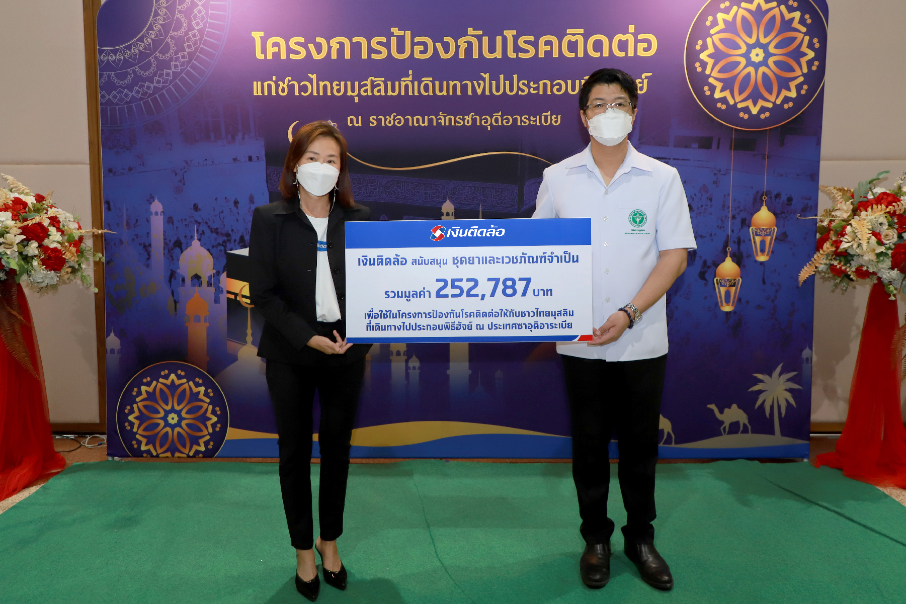 7 มิถุนายน 2565 : บริษัท เงินติดล้อ จำกัด (มหาชน) โดย นิภา วนิชวัฒน์ (ซ้าย) ผู้บริหารระดับสูง สายงานกิจกรรมเพื่อสังคม เป็นตัวแทนมอบชุดยาและเวชภัณฑ์จำเป็น จำนวน 500 ชุด รวมมูลค่า 252,787 บาท ให้แก่ โครงการป้องกันโรคติดต่อ ให้กับชาวไทยมุสลิมที่เดินทางไปประกอบพิธีฮัจย์ ณ ราชอาณาจักรซาอุดิอาระเบีย ปี 2565 เพื่อช่วยป้องกันโรคและบรรเทาอาการเจ็บป่วยให้กับประชาชนระหว่างเดินทางแสวงบุญ โดยมี น.พ.วิชาญ ปาวัน ผู้อำนวยการกองควบคุมโรคติดต่อทั่วไป กรมควบคุมโรค เป็นตัวแทนรับมอบชุดยาและเวชภัณฑ์ดังกล่าว ณ ศูนย์บริหารกิจการศาสนาอิสลามแห่งชาติเฉลิมพระเกียรติ กรุงเทพมหานคร เมื่อเร็วๆ นี้ ![]()