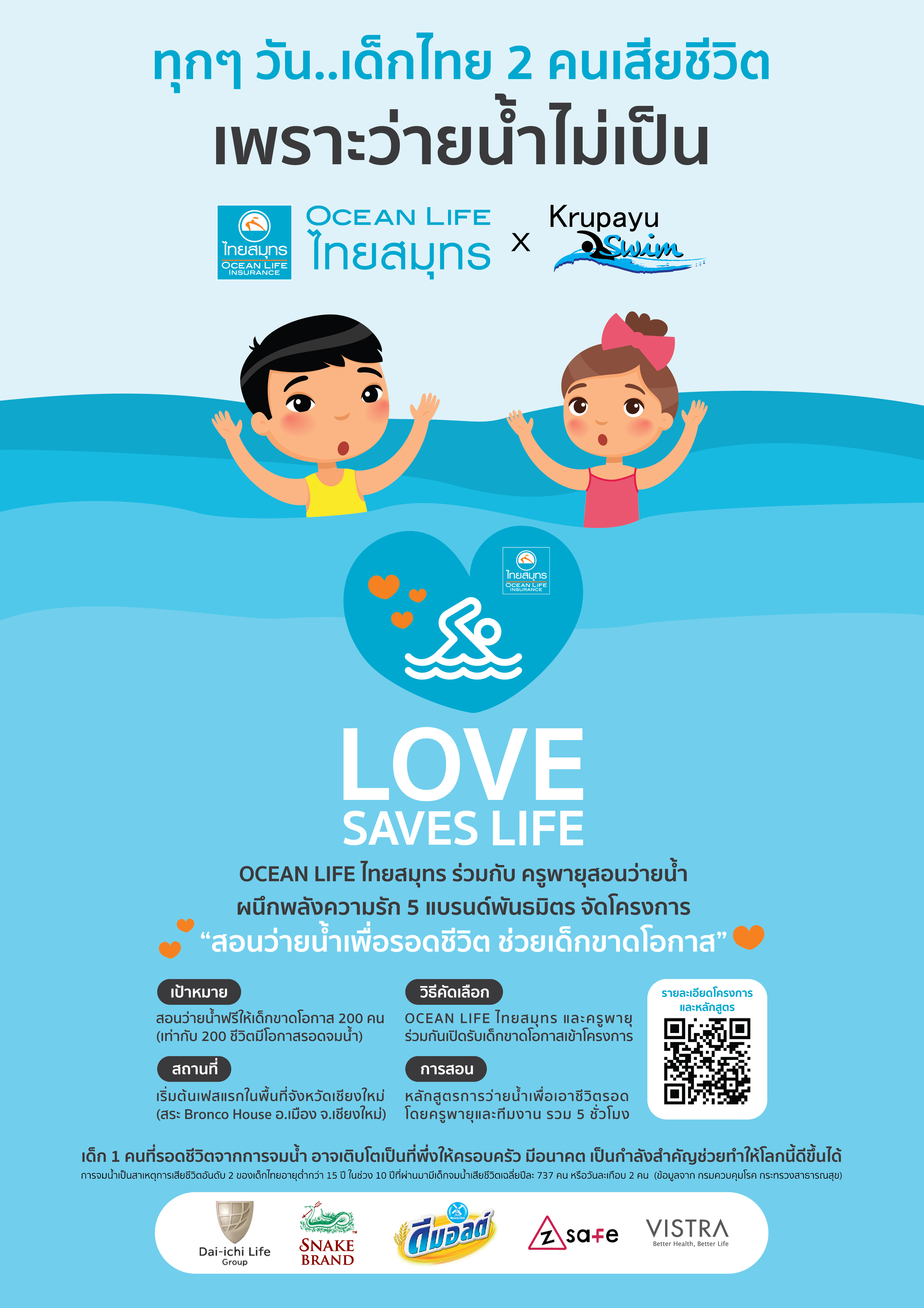 สำหรับในปีนี้เราได้เล็งเห็นปัญหาการจมน้ำของเด็กไทยอายุต่ำกว่า 15 ปี ในช่วง 10 ปีที่ผ่านมามีสถิติการเสียชีวิตถึงปีละ 737 คน หรือวันละเกือบ 2 คน* OCEAN LIFE ไทยสมุทร จึงตั้งใจจัดโครงการ OCEAN LIFE - LOVE SAVES LIFE สอนว่ายน้ำเพื่อรอดชีวิต ช่วยเด็กขาดโอกาส ร่วมกับครูพายุ สอนว่ายน้ำ ตั้งเป้าช่วยสอนเด็กจำนวน 200 คนให้ว่ายน้ำเป็น และมีทักษะการเอาตัวรอดเมื่อจมน้ำ
