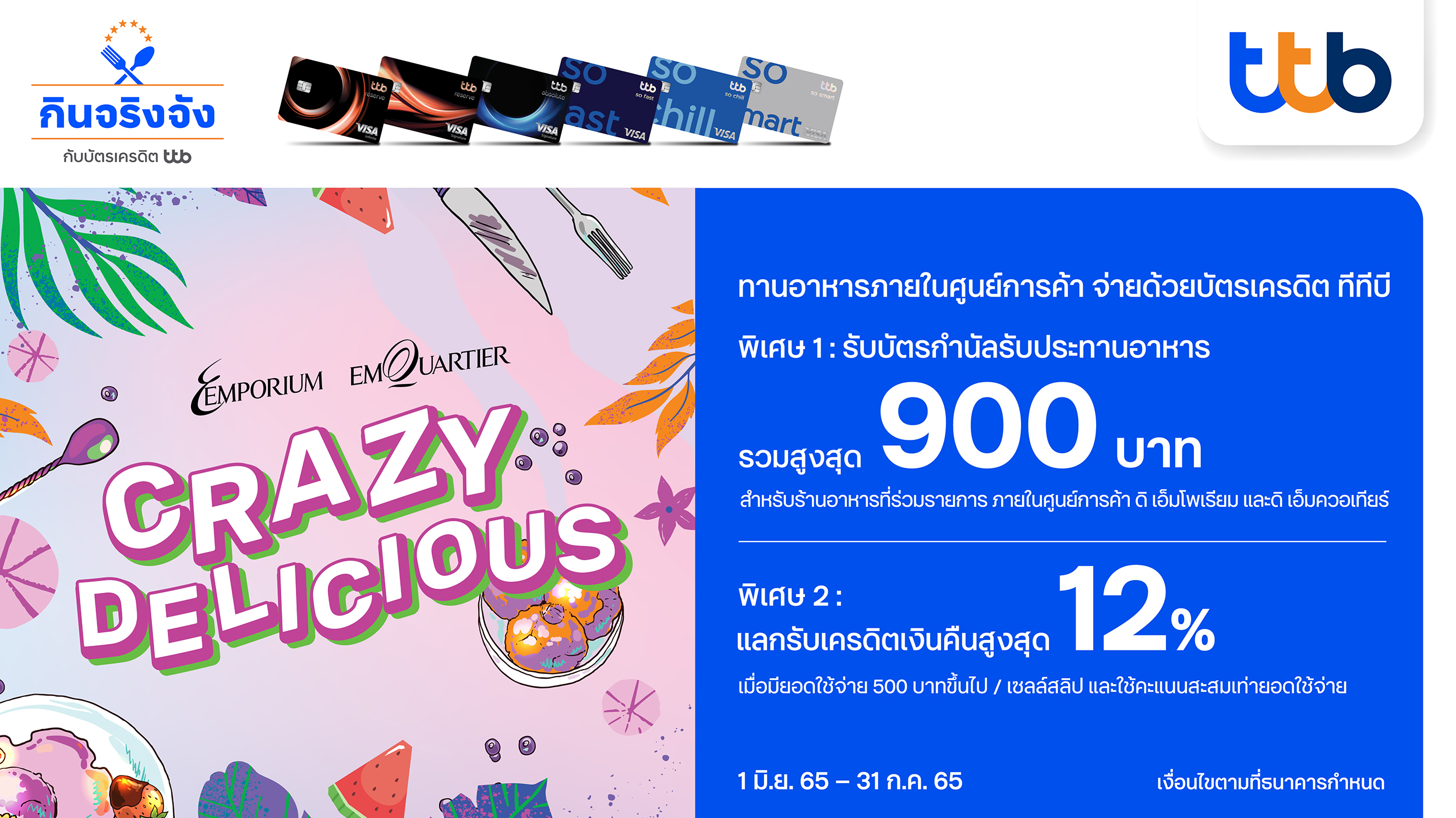 13 มิถุนายน 2565 : บัตรเครดิต ทีทีบี ร่วมกับ ศูนย์การค้า ดิ เอ็มโพเรียม และดิ เอ็มควอเทียร์ จัดแคมเปญ “CRAZY DELICIOUS” ระหว่างวันที่ 1 มิถุนายน – 31 กรกฎาคม 2565 ดังนี้