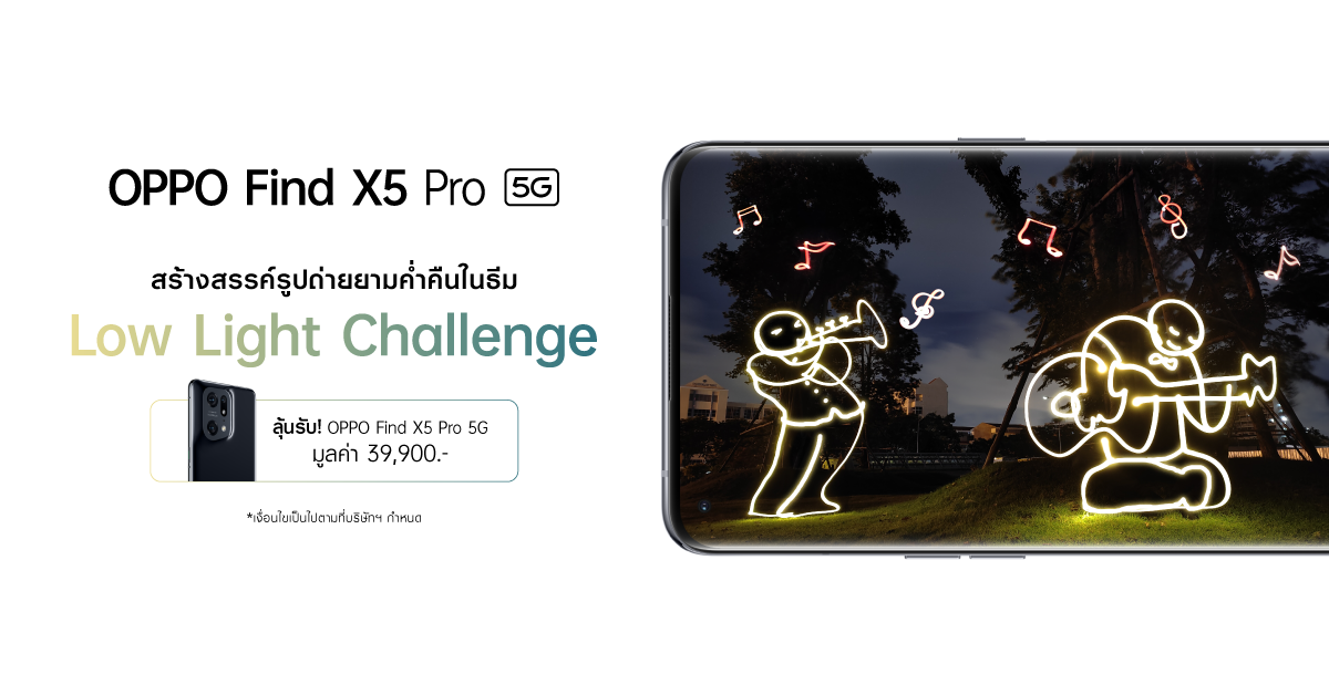 ออปโป้ สานต่อ Brand Proposition ใหม่ ‘Inspiration Ahead’ เพื่อส่งมอบประสบการณ์เทคโนโลยีที่เต็มเปี่ยมไปด้วยแรงบันดาลใจมาสู่ผู้ใช้งานทั่วโลก จัดกิจกรรม ‘Low Light Challenge’ เชิญชวนให้ทุกคนมาร่วมถ่ายทอดความสวยงามในยามค่ำคืนหรือในที่แสงน้อยที่หลายคนอาจจะยังไม่เคยได้เห็นกับโมเมนต์สุดประทับใจ เพื่อลุ้นรับ OPPO Find X5 Pro 5G รุ่นล่าสุด 1 รางวัล มูลค่า 39,990 บาท สมาร์ตโฟนระดับไฮเอนด์ ก้าวไปอีกขั้นของเทคโนโลยีการถ่ายภาพและวิดีโอ ด้วยขุมพลังจาก MariSilicon X Imaging NPU ที่ออปโป้ดีไซน์ขึ้นเองเป็นครั้งแรก โดดเด่นด้วย 4K Ultra Night Video มอบการถ่ายวิดีโอคุณภาพสูงในที่แสงน้อยได้ดีที่สุดแบบที่ไม่เคยมีมาก่อน ตอกย้ำสโลแกน ‘Empower Every Moment’ เก็บทุกโมนต์สุดประทับใจและส่งต่อแรงบันดาลใจให้ทุกคนเห็นแม้อยู่ในที่แสงน้อย