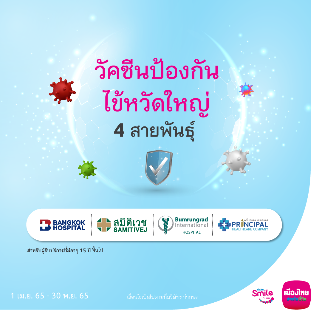ล่าสุด เมืองไทยสไมล์คลับ จัดกิจกรรมสร้างความสุขและรอยยิ้ม เพื่อมอบสิทธิพิเศษแก่สมาชิกเมืองไทยสไมล์คลับ โดยมอบความห่วงใยพร้อมดูแลสุขภาพแบบองค์รวม ทั้งการป้องกันการเกิดปัญหาด้านสุขภาพ (Health Prevention) และการสร้างภูมิคุ้มกัน (Health Protection) ไปพร้อมกันในช่วงฤดูฝน สมาชิกฯ สามารถแลกคะแนนสะสม Smile Point เพื่อรับบัตรตรวจสุขภาพโปรแกรมต่างๆ อาทิ คูปองวัคซีนป้องกันไข้หวัดใหญ่ 4 สายพันธุ์ เพื่อลดความเสี่ยงการติดเชื้อไวรัสไข้หวัดใหญ่ที่มีการระบาดในช่วงฤดูฝนและฤดูหนาว