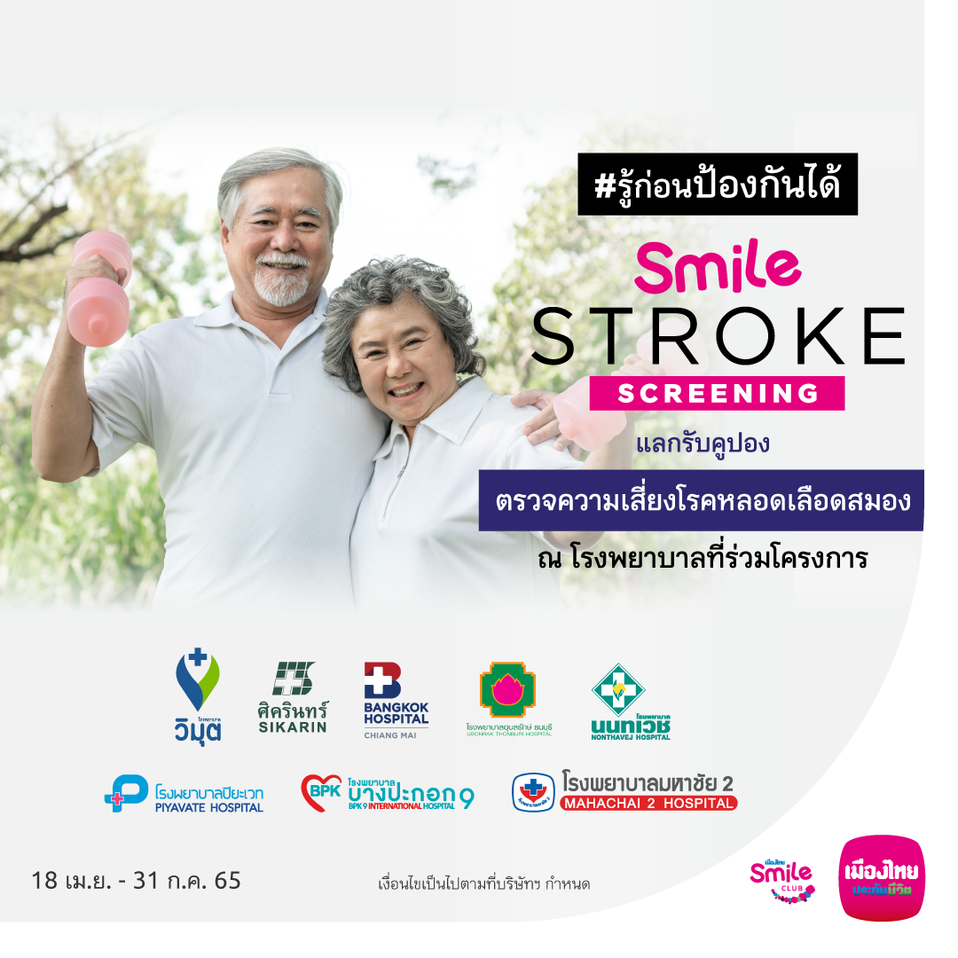 ทางเมืองไทยสไมล์คลับ ยังมีการส่งเสริมด้านการเตรียมความพร้อมในการป้องกันก่อนเกิดปัญหาด้านสุขภาพ โดยการร่วมมือกับโรงพยาบาลชั้นนำ อาทิ โรงพยาบาลวิมุต โรงพยาบาลศิครินทร์ โรงพยาบาลกรุงเทพ เชียงใหม่ โรงพยาบาลอุบลรักษ์ ธนบุรี โรงพยาบาลนนทเวช โรงพยาบาลปิยะเวท โรงพยาบาลบางปะกอก 9 อินเตอร์เนชั่นแนล และโรงพยาบาลมหาชัย 2 จัดกิจกรรมให้สมาชิกฯ ได้แลกคะแนนสะสม เพื่อรับบัตรตรวจสุขภาพ Smile Stroke Screening โปรแกรมตรวจความเสี่ยงโรคหลอดเลือดสมอง เพื่อคัดกรองและป้องกันความเสี่ยงในการเกิดโรคอัมพฤกษ์ อัมพาต ซึ่งสาเหตุหลักในการเกิดมาจากโรคหลอดเลือดสมอง