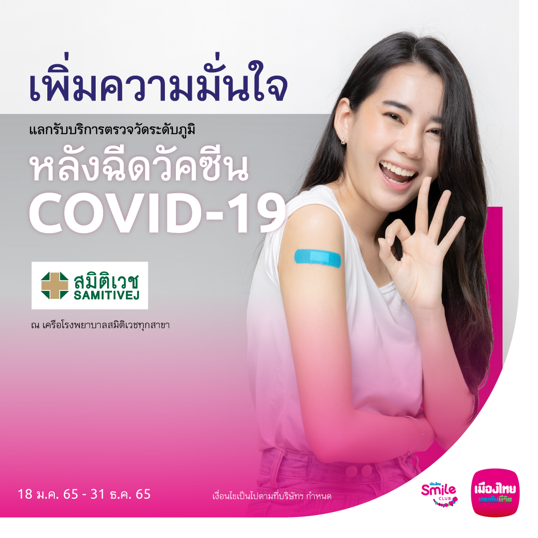 นอกจากนี้ ทางเมืองไทยสไมล์คลับยังเพิ่มความมั่นใจในการใช้ชีวิตในช่วงสถานการณ์การแพร่ระบาดของโรคติดเชื้อไวรัสโคโรน่า 2019 (Covid-19) มากขึ้น โดยสมาชิกฯ สามารถแลกคะแนนสะสมเพื่อใช้บริการตรวจวัดระดับภูมิหลังฉีดวัคซีน Covid-19 ณ เครือโรงพยาบาลสมิติเวชทุกสาขา สามารถแลกรับสิทธิ์ได้ตั้งแต่วันนี้ถึงวันที่ 31 ธันวาคม 2565 ซึ่งจะช่วยให้ทราบระดับภูมิตอบสนองของร่างกายภายหลังฉีดวัคซีน Covid-19 หรือสำหรับผู้ที่เคยติดเชื้อไวรัสโคโรนา 2019 (Covid-19) บางรายอาจจะมีอาการที่หลงเหลือหลังติดเชื้อ ทำให้มีสุขภาพไม่แข็งแรงเหมือนเดิม มีภาวะแทรกซ้อนในขณะรับการรักษา