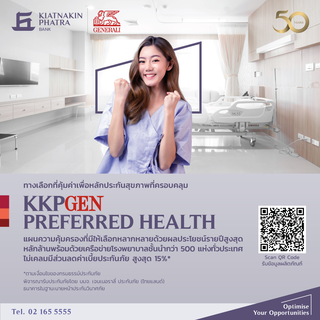 แผนประกันสุขภาพ KKPGEN PREFERRED HEALTH แบบใหม่นี้ มีข้อดีคือความคุ้มครองที่ครอบคลุมค่ารักษาพยาบาลพื้นฐานที่จำเป็น ทั้งยัง ออกแบบมาให้ลูกค้ามีทางเลือกหลากหลายตามความต้องการ ไม่ว่าจะเพื่อแบ่งเบาภาระค่าใช้จ่าย หรือเติมเต็มความคุ้มครองด้านสุขภาพที่มีอยู่แล้วให้ครอบคลุมมากยิ่งขึ้น ดังนั้น ลูกค้าแทบทุกกลุ่ม ไม่ว่าจะเป็นเจ้าของกิจการ พนักงานบริษัท หรืออาชีพอิสระก็สามารถใช้ KKPGEN PREFERRED HEALTHปกป้องความมั่งคั่ง สร้างหลักประกันทางสุขภาพได้” ![]()