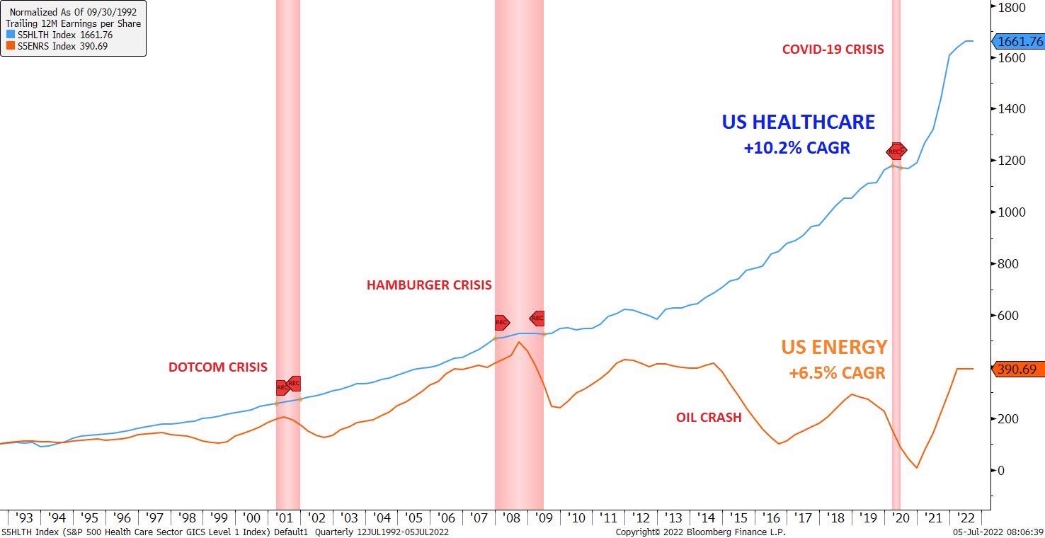 ขณะที่กลุ่มที่เติบโตสวนทางอย่างชัดเจน คือ กลุ่มเฮลธ์แคร์ (Healthcare) โดยข้อมูลในอดีตพบว่า ผลกำไรของกลุ่ม Healthcare ยังคงเติบโตได้ดี และในระยะยาวยังเติบโตได้อย่างต่อเนื่องในอัตราที่สูงกว่าภาพรวมของดัชนี S&P 500 โดยเมื่อเปรียบเทียบข้อมูลจากบลูมเบิร์กพบว่า ในช่วง 30 ปีมานี้ บริษัทจดทะเบียน S&P 500 มีอัตราการเติบโตของกำไร 6.9% ต่อปี ในขณะที่อัตรากลุ่ม Healthcare มีอัตราการเติบโตของกำไรเฉลี่ยอยู่ที่ 10.2% ต่อปี