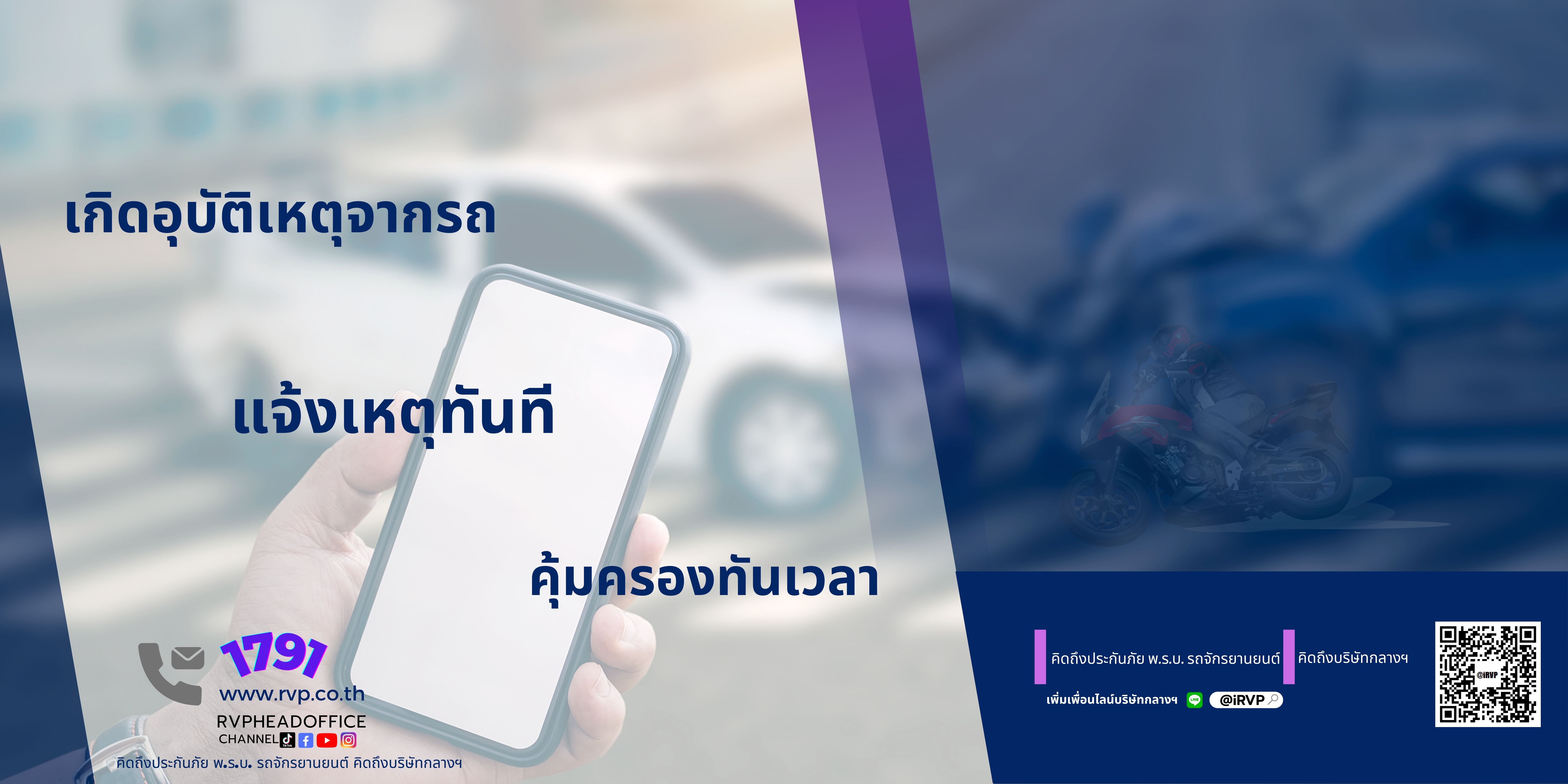 ดังนั้น เจ้าของรถทุกคันอย่าลืมจัดทำประกันภัย พ.ร.บ. เพื่อจะได้รับการเยียวยาตามกฎหมาย และสำหรับผู้ใช้รถจักรยานยนต์ ที่ทำประกันภัย พ.ร.บ. สามารถตรวจสอบความคุ้มครองได้ง่ายๆ เพียงแค่แอดไลน์ @iRVP มาเป็นเพื่อนกับบริษัทกลางฯ แล้วคลิกไปที่เมนู “พ.ร.บ.ของฉัน” กรอกชื่อ นามสกุล เลขบัตรประจำตัวประชาชน ระบบจะค้นข้อมูลให้ทราบ ไม่ว่าจะเป็นเลขที่กรมธรรม์, ระยะประกันภัยความคุ้มครองเริ่มต้นและสิ้นสุด และจำนวนวันคุ้มครองคงเหลือแจ้งไว้ด้วยครับ สะดวกสบาย ตรวจสอบได้ทุกที่ทุกเวลา ไม่ต้องกังวลเมื่อเกิดอุบัติเหตุ ![]()
