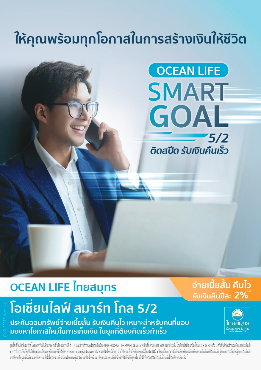 ดังนั้น OCEAN LIFE ไทยสมุทร จึงได้ส่งแบบประกันชีวิตที่น่าจับตามองในยุคนี้ “โอเชี่ยนไลฟ์ สมาร์ท โกล 5/2” ประกันสะสมทรัพย์สุดสมาร์ทที่ให้ครบทั้งความคุ้มครองชีวิต และมีเงินคืนระหว่างสัญญา จ่ายเบี้ยเพียง 2 ปี ให้ความคุ้มครอง 5 ปี ระหว่างปีกรมธรรม์ที่ 2 – 5 รับความคุ้มครองชีวิต*สูงสุด 200% พร้อมเงินคืน 2% ระหว่างสัญญา ณ สิ้นปีกรมธรรม์ที่ 1 – 4 และเมื่อครบกำหนดสัญญารับเงินก้อน 202% รวมรับเงินผลประโยชน์ตลอดอายุสัญญาสูงสุด 210%
