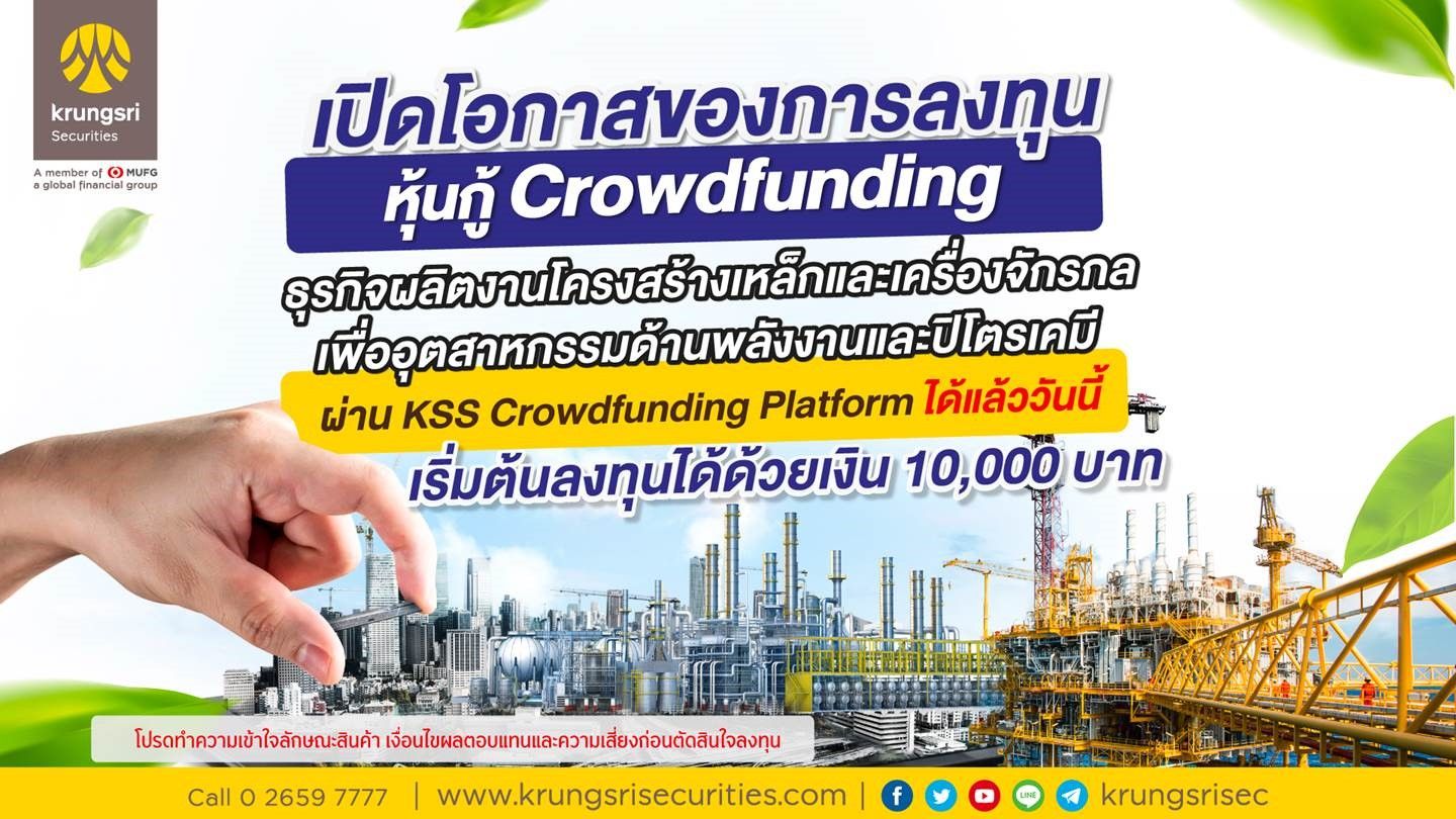 20 กรกฎาคม 2565 : บริษัทหลักทรัพย์ กรุงศรี จำกัด (มหาชน) (บล.กรุงศรี) เปิดให้ลงทุนในหุ้นกู้คราวด์ฟันดิงเพื่อธุรกิจผลิตงานโครงสร้างเหล็กและเครื่องจักรกล เพื่ออุตสาหกรรมพลังงาน ผ่าน KSS Crowdfunding Platform ได้แล้ววันนี้ – 1 สิงหาคม 2565 มูลค่าจองซื้อขั้นต่ำ 10,000 บาท มีสถาบันการเงินเป็นผู้ค้ำประกัน และไม่สามารถไถ่ถอนก่อนกำหนด ทางเลือกใหม่การลงทุนที่ให้ผลตอบแทนสม่ำเสมอ ช่วยกระจายความเสี่ยงพอร์ท ได้รับเงินต้นคืนเป็นระยะ และลงทุนสะดวกผ่านแพลตฟอร์มออนไลน์