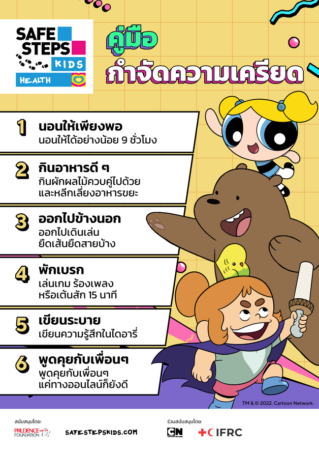 สามารถรับชม วิดีโอ “คู่มือกำจัดความเครียด” ได้ที่ https://www.safestepskids.com หรือผ่านช่องทางยูทูปได้ที่ https://www.youtube.com/watch?v=5xnBo_eOUL0 และทางช่องการ์ตูนเน็ตเวิร์ค นอกจากนี้ IFRC จะมีการจัดส่งสื่อต่างๆ เกี่ยวกับ “คู่มือกำจัดความเครียด” ไปยังโรงเรียนและชุมชนต่างๆ เพื่อสร้างการรับรู้ต่อไป ![]()