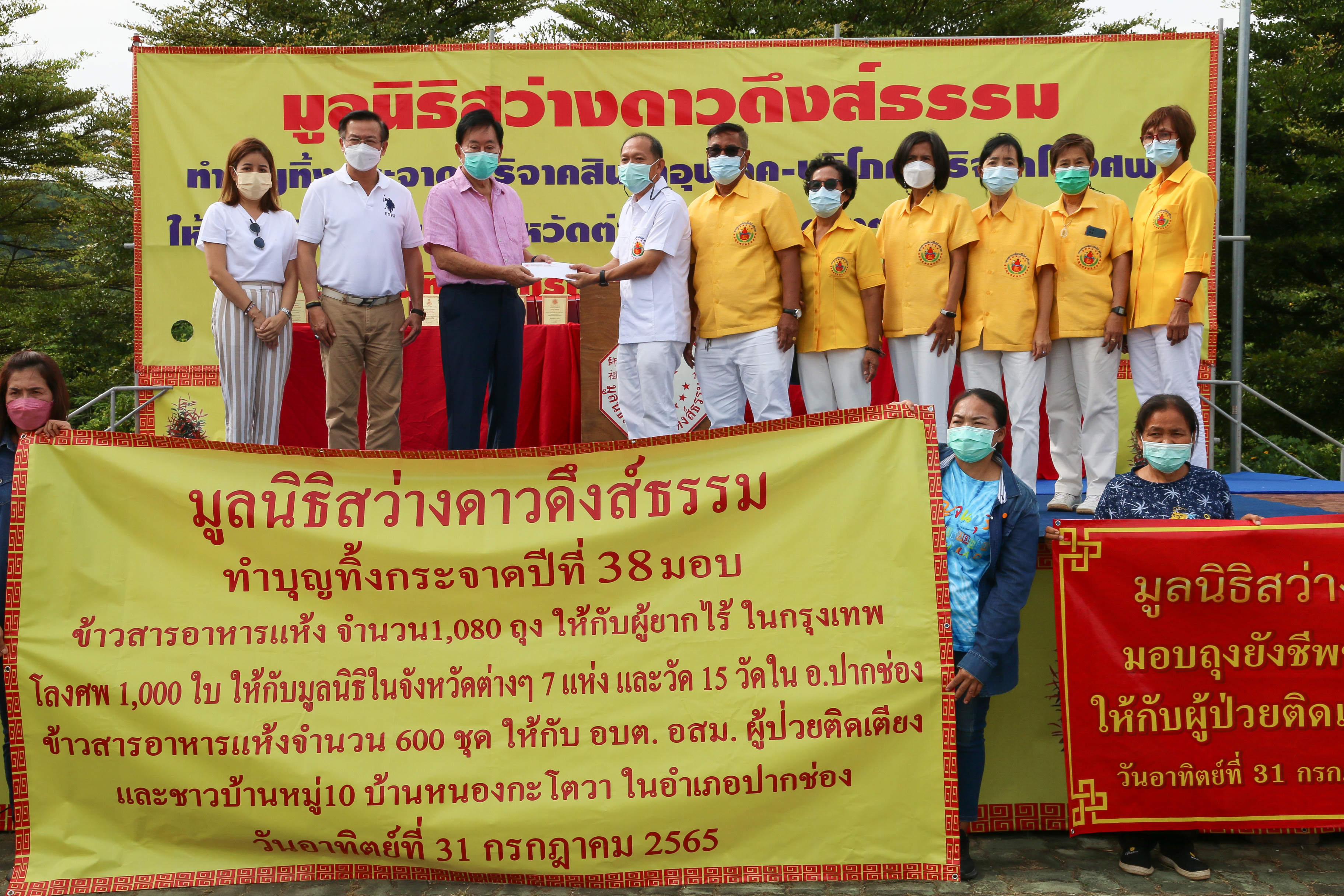 พร้อมกันนี้ยังร่วมบริจาคโลงศพ จำนวน 200 หีบ และผ้าห่อศพ ให้กับมูลนิธิสว่างดาวดึงส์ (ปากช่อง) เพื่อไปมอบให้วัดและมูลนิธิต่างๆ โดยมีคุณวิชัย ชูชัยเจริญ ประธานมูลนิธิสว่างดาวดึงส์ธรรมและประธานจัดงาน ร่วมมอบ ณ อุทยานวิหารเซียน ปากช่อง