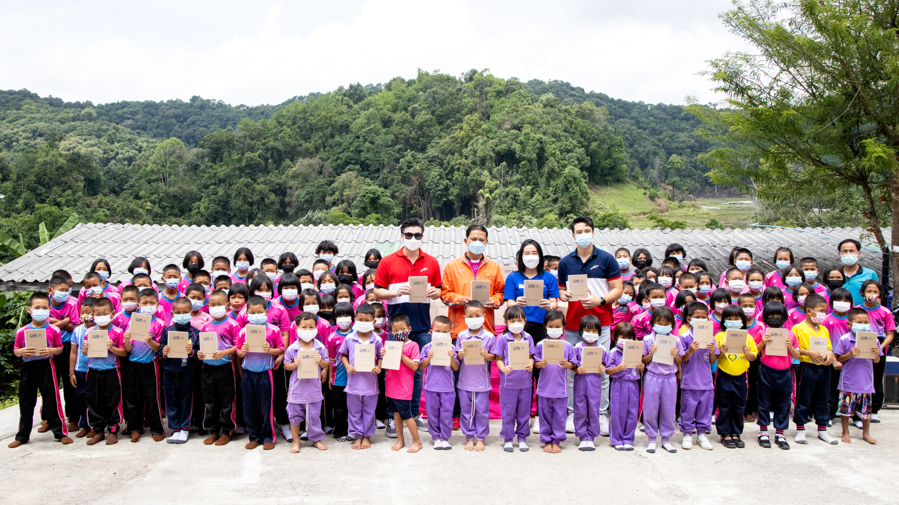 3 สิงหาคม 2565 : บมจ.กรุงไทย-แอกซ่า ประกันชีวิต นำโดย คุณสุกัญญา อิสรานุวัฒน์ชัย รองประธานอาวุโส ฝ่ายสื่อสารการตลาดและภาพลักษณ์องค์กร (คนกลาง) มอบสมุดปกพลาสติกรีไซเคิล จากกิจกรรม“Think ก่อนทิ้ง” ภายใต้แคมเปญ “Commit to Climate เราปรับ โลกเปลี่ยน” จำนวน 1,000 เล่ม แก่นักเรียนโรงเรียนนิยมไพรผาหมอน อินทนนท์ อำเภอจอมทอง จังหวัดเชียงใหม่