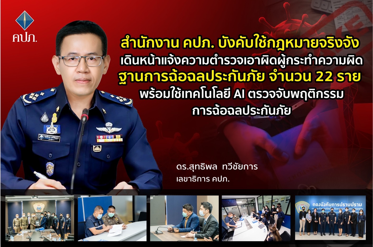 3 สิงหาคม 2565 : ดร. สุทธิพล ทวีชัยการ เลขาธิการคณะกรรมการกำกับและส่งเสริมการประกอบธุรกิจประกันภัย (เลขาธิการ คปภ.) เปิดเผยว่า เมื่อวันที่ 26 กรกฎาคม 2565 ได้มอบหมายให้ นายอดิศร พิพัฒน์วรพงศ์ ผู้ช่วยเลขาธิการ สายกฎหมายและคดี สำนักงานคณะกรรมการกำกับและส่งเสริมการประกอบธุรกิจประกันภัย (สำนักงาน คปภ.) เข้าร้องทุกข์กล่าวโทษผู้กระทำความผิดด้านประกันภัย จำนวน 22 ราย ต่อ พล.ต.ต.พุฒิเดช บุญกระพือ ผู้บังคับการปราบปรามการกระทำความผิดเกี่ยวกับอาชญากรรมทางเศรษฐกิจ (ผบ.ปอศ.) หรือ ตำรวจ ECD