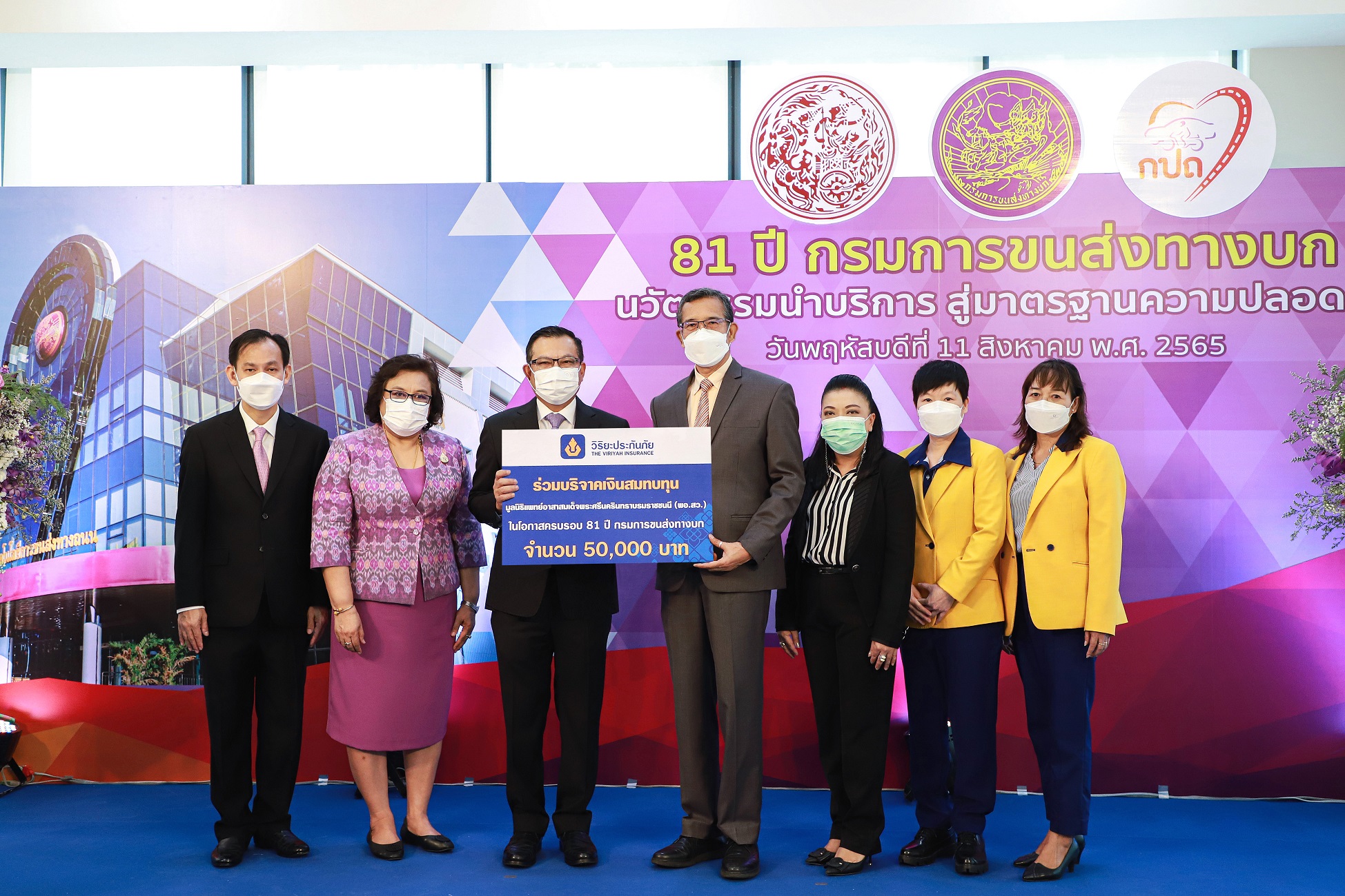 15 สิงหาคม 2565 : จิรุตม์ วิศาลจิตร อธิบดีกรมการขนส่งทางบก รับมอบเงินสมทบทุนมูลนิธิแพทย์อาสาสมเด็จพระศรีนครินทราบรมราชชนนี (พอ.สว.) จำนวน 50,000 บาท จาก บริษัท วิริยะประกันภัย จำกัด (มหาชน) โดยมี สุรพงษ์ กิจชิต ผู้จัดการฝ่ายปฏิบัติการภาค 6 (ภาคกรุงเทพฯ) ด้านสาขา เป็นผู้แทนบริษัทฯมอบ เนื่องในโอกาสวันคล้ายวันสถาปนา กรมการขนส่งทางบก ครบรอบ 81 ปี ณ อาคารศูนย์นวัตกรรมและเทคโนโลยีการขนส่งทางถนน กรมการขนส่งทางบก จตุจักร กรุงเทพ ![]()