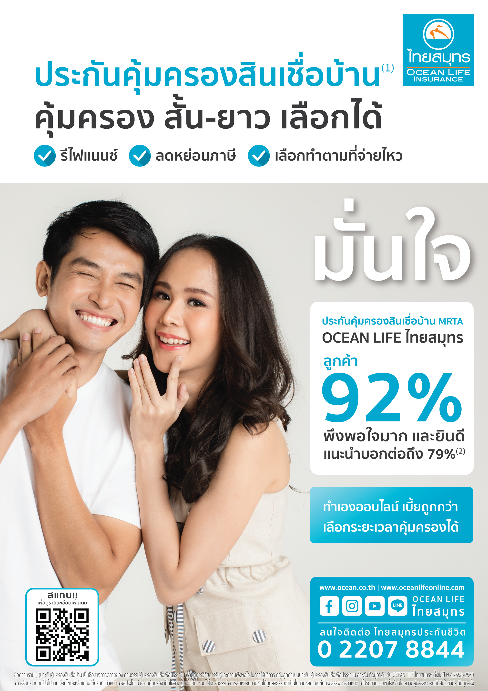 ดังนั้น จึงขอแนะนำทางเลือกใหม่จาก OCEAN LIFE ไทยสมุทร สำหรับท่านที่กำลังมองหาประกันคุ้มครองสินเชื่อบ้านที่สามารถทำเองได้ คุ้มค่า เลือกระยะเวลาเองได้ตามวัตถุประสงค์ในการซื้อบ้าน “ประกัน MRTA” (Mortgage Reducing Term Assurance) ประกันชีวิตคุ้มครองสินเชื่อบ้านที่ลูกค้า 92 % พึงพอใจมาก และ 79 % ** ยินดีจะแนะนำและบอกต่อ โดยคุ้มครองความเสี่ยงให้กับผู้กู้ในช่วงระยะเวลาที่ต้องผ่อนสินเชื่อ ทั้งการเสียชีวิต และทุพพลภาพสิ้นเชิงถาวร ทุนประกันขั้นต่ำ 500,000 บาท