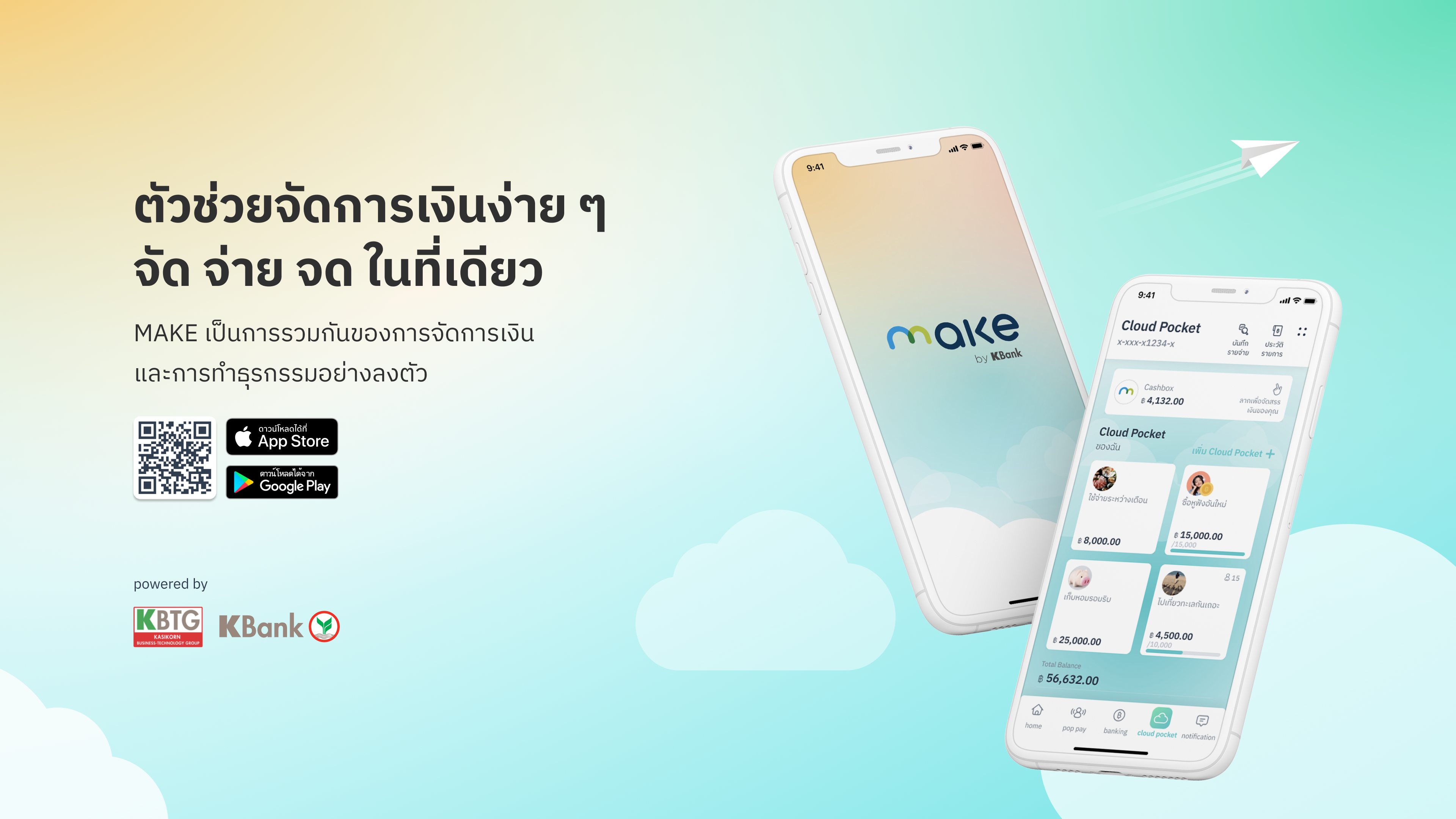 17 สิงหาคม 2565 : นายเรืองโรจน์ พูนผล ประธานกลุ่มบริษัท กสิกร บิซิเนส-เทคโนโลยี กรุ๊ป (KBTG) เปิดเผยว่า KBTG ได้พัฒนา MAKE by KBank แอปพลิเคชันจัดการเงิน ให้ผู้ใช้สามารถจัด จ่าย จด ในที่เดียว พร้อมฟีเจอร์ Cloud Pocket ที่ให้ผู้ใช้สามารถแบ่งเงินในบัญชีออกเป็นกระเป๋าย่อยๆ เป็นสัดส่วน สามารถกำหนดเป้าหมายในการเก็บเงินของแต่ละกระเป๋าได้ เช่น ค่าชอปปิ้ง ค่าใช้จ่ายรายเดือนของบริการต่าง ๆ เก็บเงินเพื่อการท่องเที่ยว เพื่อซัพพอร์ตศิลปิน ออมเงินเพื่ออนาคต ฯลฯ ช่วยให้ผู้ใช้งานเกิดวินัยทางการเงินและทำให้บรรลุเป้าหมายการบริหารเงินที่วางไว้
