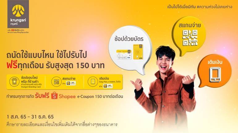 31 สิงหาคม 2565 : กรุงศรี (ธนาคารกรุงศรีอยุธยา จำกัด (มหาชน)) มอบสิทธิพิเศษสำหรับลูกค้า เพียงทำภารกิจช้อปด้วยบัตรกรุงศรี เดบิต หรือ Krungsri Boarding Card ผ่านช่องทางออนไลน์ หรือที่ร้านค้าผ่านเครื่อง EDC ทั่วโลก หรือภารกิจสแกนจ่ายผ่าน KMA-Krungsri Mobile App หรือภารกิจเติมเงินผ่าน KMA-Krungsri Mobile App รับฟรี Shopee e-Coupon มูลค่า 50 บาท/เดือน/ภารกิจ หรือทำครบทุกภารกิจ รับฟรี Shopee e-Coupon มูลค่า 150 บาท/เดือน ระยะเวลาภารกิจเริ่มตั้งแต่วันนี้ – 31 ธันวาคม 2565 เงื่อนไขต่างๆ เป็นไปตามที่ธนาคารกำหนด![]()