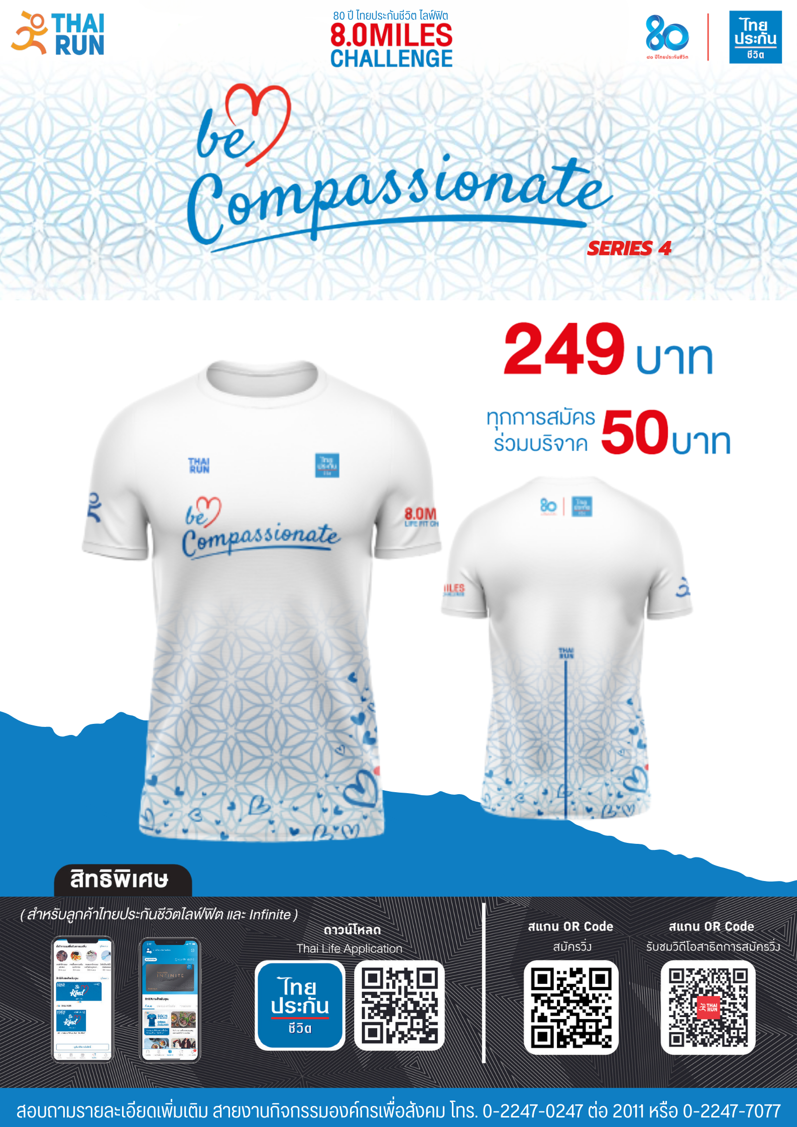 สำหรับความพิเศษของซีรีส์ 4 “Be Compassionate” เป็นการเชิญชวนทุกท่านออกกำลังกายเพื่อให้หัวใจแข็งแรง เนื่องในวันหัวใจโลกซึ่งตรงกับวันที่ 29 กันยายนของทุกปี พร้อมทั้งแบ่งปันความรัก และส่งต่อการให้ โดยทุกการสมัครวิ่งจะได้ร่วมบริจาค 50 บาท และทุกการส่งผลวิ่งครบ 8 ไมล์ หรือ 12.8 กิโลเมตร บริษัทฯ จะร่วมบริจาค 80 บาท สมทบโครงการ “หนึ่งคนให้ หลายคนรับ เพื่อชีวิตใหม่หัวใจเด็ก” สำหรับเป็นค่าใช้จ่ายผ่าตัดผู้ป่วยเด็กโรคหัวใจพิการแต่กำเนิดที่ขาดแคลนทุนทรัพย์ ซึ่งเป็นโครงการที่บริษัทฯ ดำเนินการมาตั้งแต่ปี 2560 จนถึงปัจจุบัน และสามารถส่งมอบเงินสมทบโครงการฯ แล้วรวมทั้งสิ้น 9,600,000 บาท นำไปช่วยเหลือผ่าตัดผู้ป่วยเด็กโรคหัวใจพิการ จำนวน 48 ราย