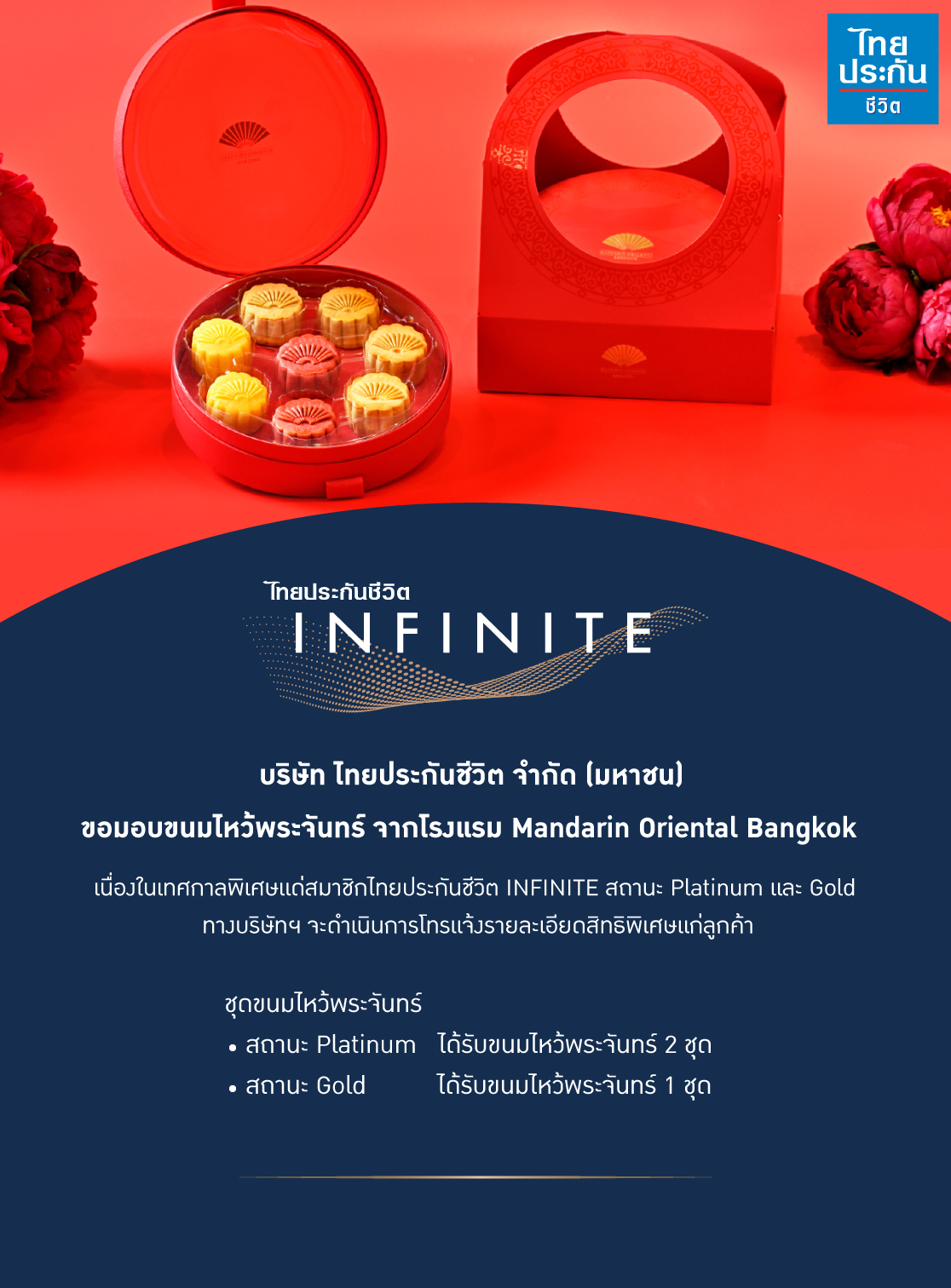 2 กันยายน 2565. : บริษัท ไทยประกันชีวิต จำกัด (มหาชน) ร่วมเฉลิมฉลองเทศกาลไหว้พระจันทร์ พร้อมมอบสิทธิพิเศษแก่สมาชิกไทยประกันชีวิต INFINITE สถานะ Platinum และ Gold รับขนมไหว้พระจันทร์ จากโรงแรม Mandarin Oriental Bangkok ฟรี (1 ท่าน / 1 สิทธิ์ ตลอดแคมเปญ) โดยสมาชิกไทยประกันชีวิต INFINITE สถานะ Platinum ได้รับขนมไหว้พระจันทร์ 2 ชุด มูลค่า 1,776 บาท และสมาชิกไทยประกันชีวิต INFINITE สถานะ Gold ได้รับขนมไหว้พระจันทร์ 1 ชุด มูลค่า 888 บาท ![]()