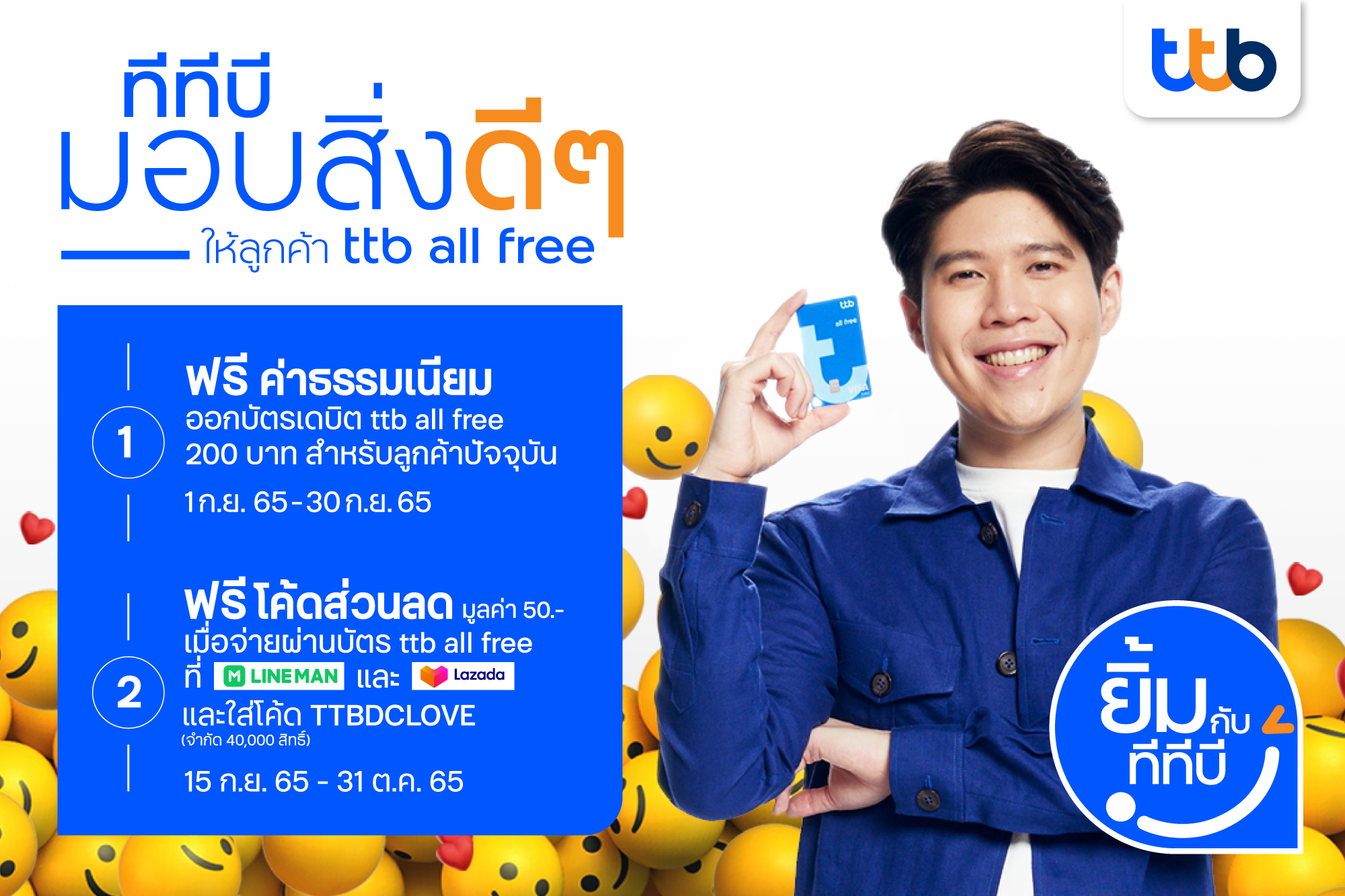 22 กันยายน 2565 : นางสาวนันทพร ตั้งเจริญศิริ รองประธานเจ้าหน้าที่บริหาร หัวหน้าบริหารความสัมพันธ์และประสบการณ์ลูกค้าบุคคล ทีเอ็มบีธนชาต หรือ ทีทีบี เปิดเผยว่า ธนาคารตั้งใจมอบสิ่งดีๆ ให้กับลูกค้า จึงออกแคมเปญ “ยิ้มกับทีทีบี” หวังว่าแคมเปญนี้จะช่วยกระตุ้นรอยยิ้มให้กับลูกค้าทุกคน ประเดิมด้วยกิจกรรมแจกโค้ดส่วนลด 40,000 โค้ด มูลค่ารวม 2,000,000 บาท เพื่อใช้เป็นส่วนลดค่ากิน ค่าช้อป ในแอป LINE MAN และ Lazada อีกทั้งตั้งใจที่ช่วยเพิ่มความสะดวกในการใช้งานบัญชี โดยให้ฟรีค่าธรรมเนียมการออกบัตรเดบิต ทีทีบี ออลล์ฟรี มูลค่า 200 บาทสำหรับลูกค้าปัจจุบัน เพื่อเป็นการขอบคุณลูกค้าที่ใช้บริการและอยู่กับธนาคารมาโดยตลอด