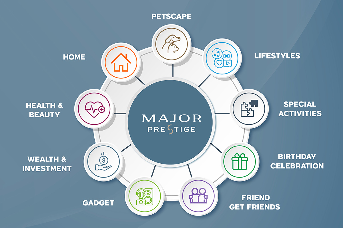 สำหรับ “MAJOR PRESTIGE” ได้รวบรวมเอกสิทธิ์ส่วนลดจากร้านค้าแบรนด์ดัง และบริการหลังการขาย เพื่อส่งมอบคุณภาพชีวิตที่เหนือระดับให้ลูกบ้านเมเจอร์ฯ ที่มีมากถึง 9 ด้าน ประกอบด้วย 1. HOME จัดการทุกเรื่องเกี่ยวกับบ้านได้อย่างสะดวกสบาย ด้วย Mobile Application “LIFESCAPE” ซึ่งออกแบบมาเป็นอย่างดี ไม่ว่าจะเป็นการติดต่อนิติบุคคล บริการดูแลซ่อมบำรุง ทำความสะอาด ขนย้ายสิ่งของ บำรุงรักษา ชำระค่าบริการ และบริการอื่นๆ พร้อมส่วนลดพิเศษมากมายในแต่ละบริการ 2. LIFESTYLE ดื่มด่ำกับประสบการณ์พิเศษ ด้วยเอกสิทธิ์ด้านไลฟ์สไตล์ที่หลากหลาย รวมถึงกิจกรรมที่ตอบโจทย์การใช้ชีวิต อาทิ ท่องเที่ยว ช้อปปิ้ง เป็นต้น