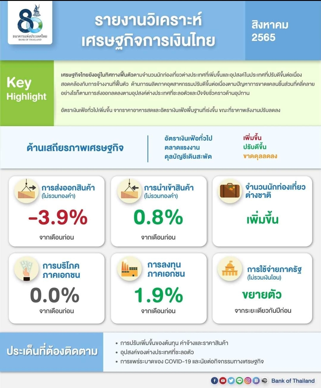 เสถียรภาพเศรษฐกิจ อัตราเงินเฟ้อทั่วไปเพิ่มขึ้นจากเดือนก่อนจากอัตราเงินเฟ้อหมวดอาหารสดและอัตราเงินเฟ้อพื้นฐานเป็นสำคัญ ขณะที่อัตราเงินเฟ้อหมวดพลังงานลดลงตามราคาน้ำมันดิบในตลาดโลก สำหรับตลาดแรงงานทยอยฟื้นตัวตามภาวะเศรษฐกิจ ส่วนดุลบัญชีเดินสะพัดขาดดุลลดลงจากดุลบริการ รายได้ และเงินโอนที่ปรับดีขึ้น ขณะที่ดุลการค้าขาดดุลมากขึ้นตามมูลค่าการนำเข้าเชื้อเพลิงที่เพิ่มขึ้นเป็นสำคัญ