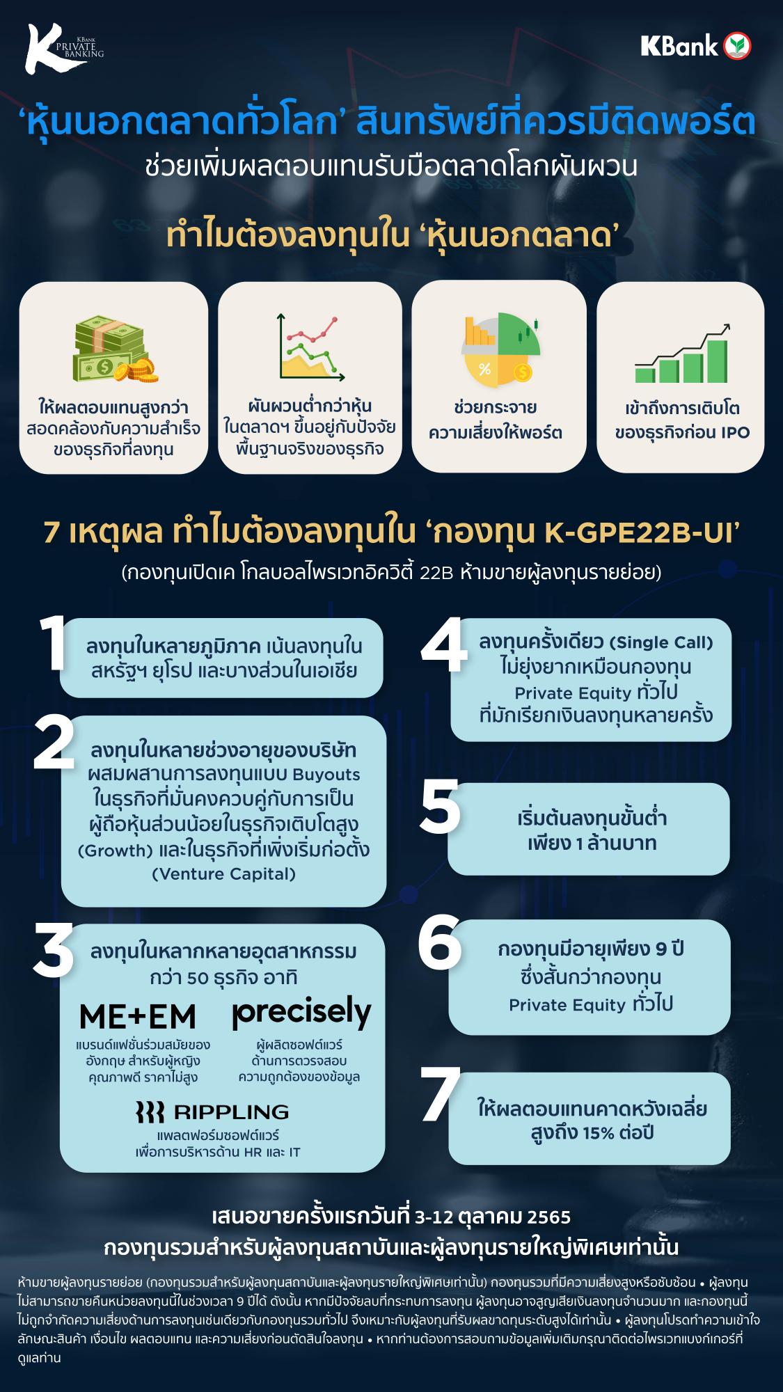 ล่าสุด KBank Private Banking ได้เสนอขายกองทุนหุ้นนอกตลาดใหม่ อย่างกองทุน K-GPE22B –UI (K Global Private Equity 22B Not for Retail Investors) โดยมี Lombard Odier เป็นผู้จัดการกองทุนหลักซึ่งมีประสบการณ์ลงทุนในไพรเวทมาร์เก็ตมาเป็นเวลานาน โดยกองทุนนี้มี 7 จุดเด่นสำคัญ ได้แก่